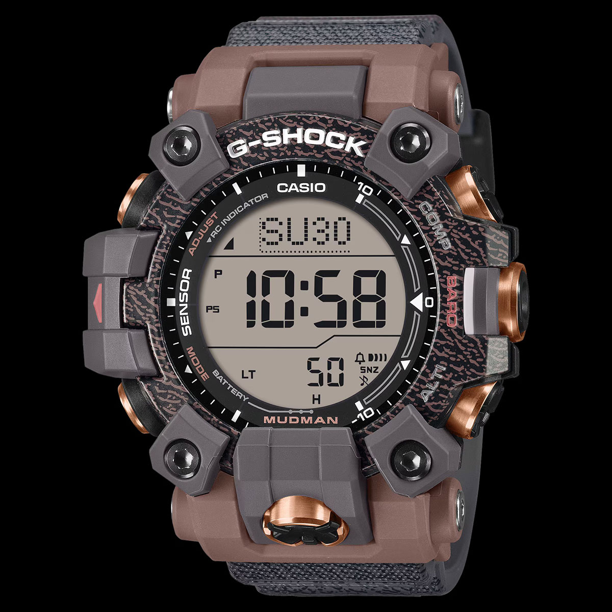 MASTER OF G(マスターオブG)の「マッドマン GW-9502KJ-8JR」は環境保護団体のアースウォッチ ジャパンとのコラボレーションモデル。絶滅危惧種であるカバをテーマとして、カバの体色と、分厚くてザラザラした皮膚の質感をベゼルに再現している。マッドマンらしく、防塵防泥構造を備え、フィールドでのハードな活動にも耐えうる性能を有する。