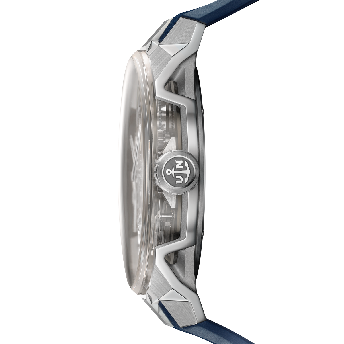 同作がユニークなのはデザインだけではない。フライングトゥールビヨンは、ユリス・ナルダン独自の 「ユリス ・ アンカー・コンスタント ・ エスケープメント」を採用する。これは主ゼンマイの巻き上げ残量変化による出力エネルギーの変動が生じても、 テンプにかかる力を均一にし、作動の安定性を高めて等時性を高めるというものだ。アンクルを固定した円形フレームがふたつの板バネによって宙に浮くように支えられる構造を備え、板バネが力を受けることで曲がりつつ、安定した状態を維持する。同機構の革新性は高く評価されており、2015年のジュネーブ・ウォッチメイキング・グランプリでトゥールビヨン部門賞を受賞している。