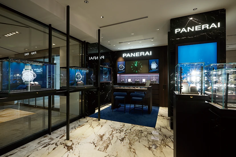 エントランスから左手奥に位置するパネライのコーナーは最新のコンセプトでデザイン。大理石調の床やウッドとスティールを組み合わせた内装によって、ブランドの核である海やテクノロジーを感じさせる世界が構築されている。