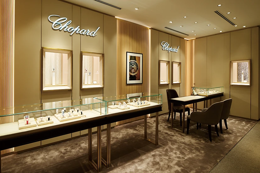 正面奥にコーナーを構えるもうひとつのブランドがショパール。2025年11月に移設・拡張したばかりのコーナーは、エレガンスを感じさせるゴールドで統一され、ショパールの描くラグジュアリーな世界観が堪能できる。