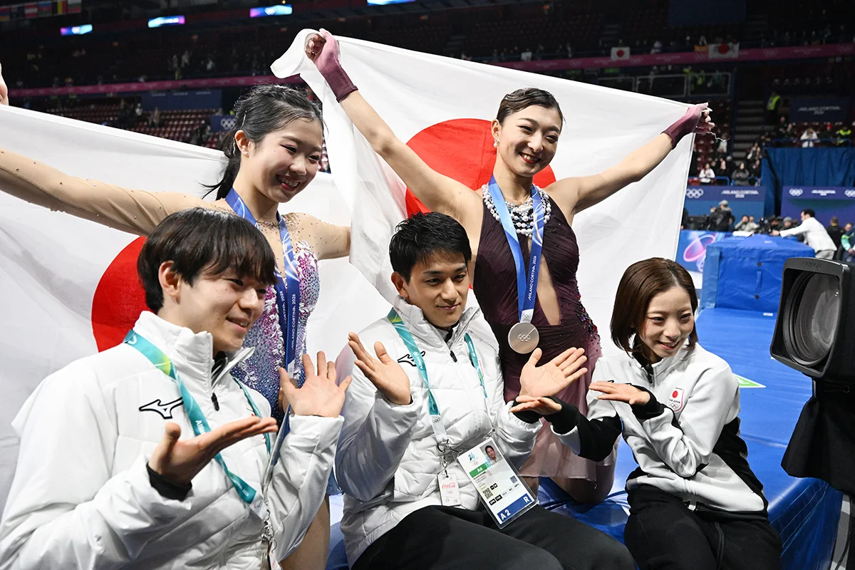 フィギュア女子での表彰式。坂本花織が銀メダル、中井亜美が銅メダルを受賞。そこに鍵山優真と、三浦璃来、木原龍一ペアもフレームの中へ。