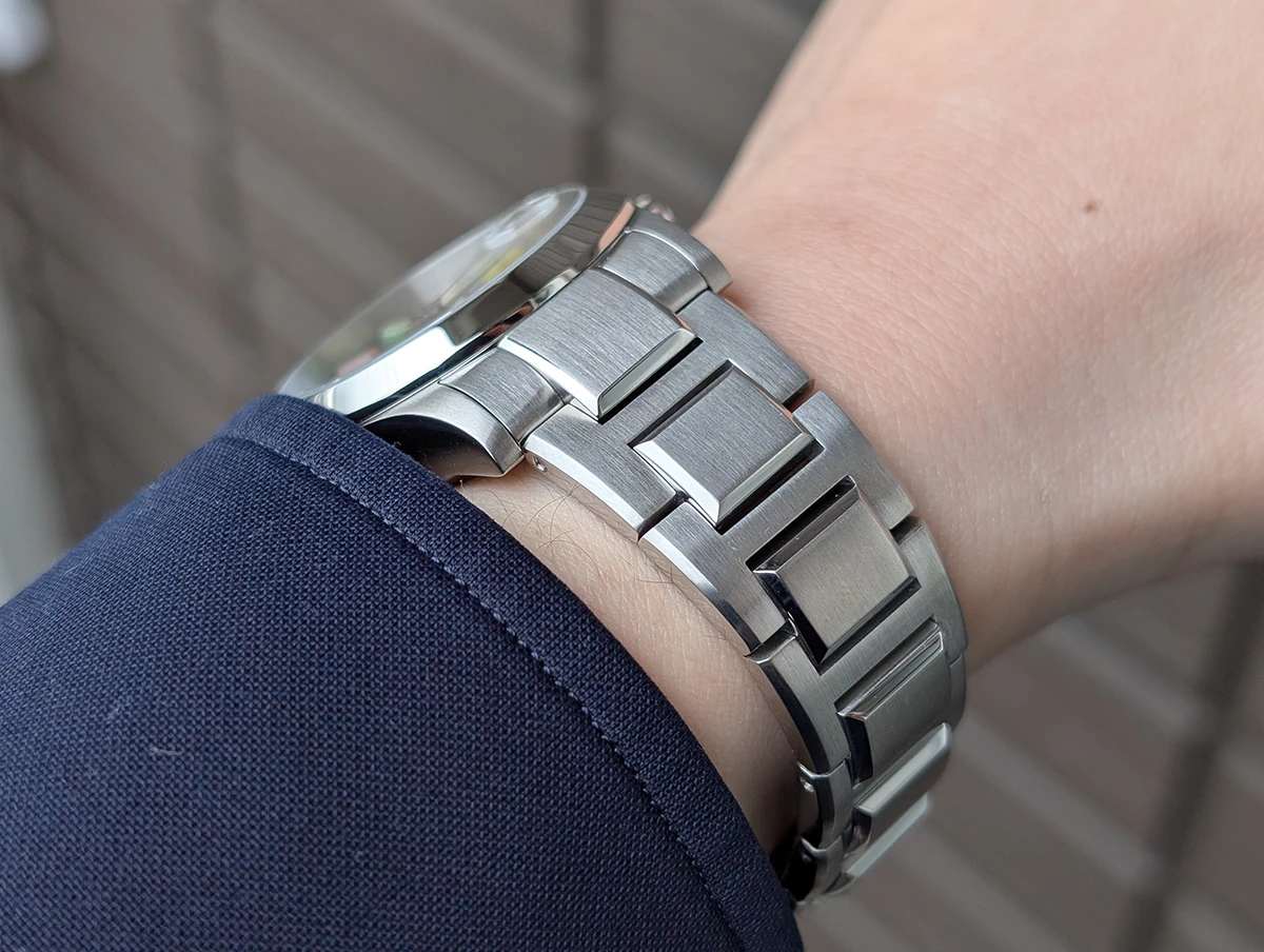 実際に腕に装着してみると、直径36mmのケースは腕周り16.5cmの筆者の腕にもすっきりと収まる。やや肉厚なケースはそれなりに重量があるものの、がっしりとしたブレスレットが組み合わされているため、重量バランスは良好だ。1日中着用しても疲れを感じることはなかった。