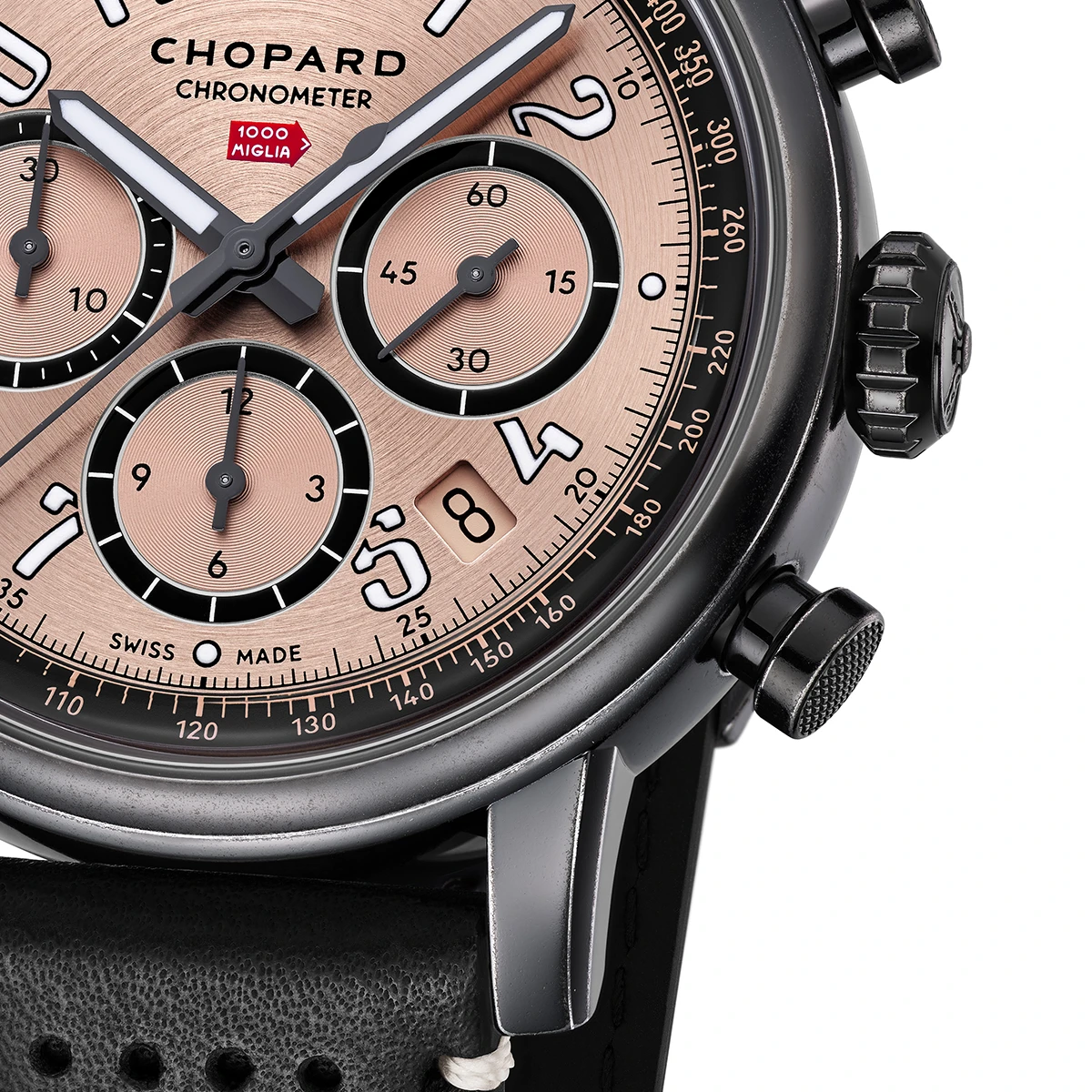 これまでショパールでは、セラマイズドチタンのケースを採用したモデルにおいて、腕時計全体にモノトーンに統一する傾向が見られた。まるでステルス戦闘機を思わせるように、ハイテクノロジーかつミステリアスな実験機としての印象を醸し出していたのだ。