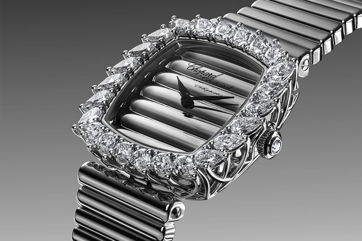 そして最後に、新発表されたショパールのレディースモデルの中から「ルール・ドゥ・ディアマン」を紹介しよう。本作は1960年代のアーカイブモデルに着想を得たデザインであり、文字盤からブレスレットへとシームレスに連なるフルーテッドゴールドリンクブレスレットが特徴的だ。