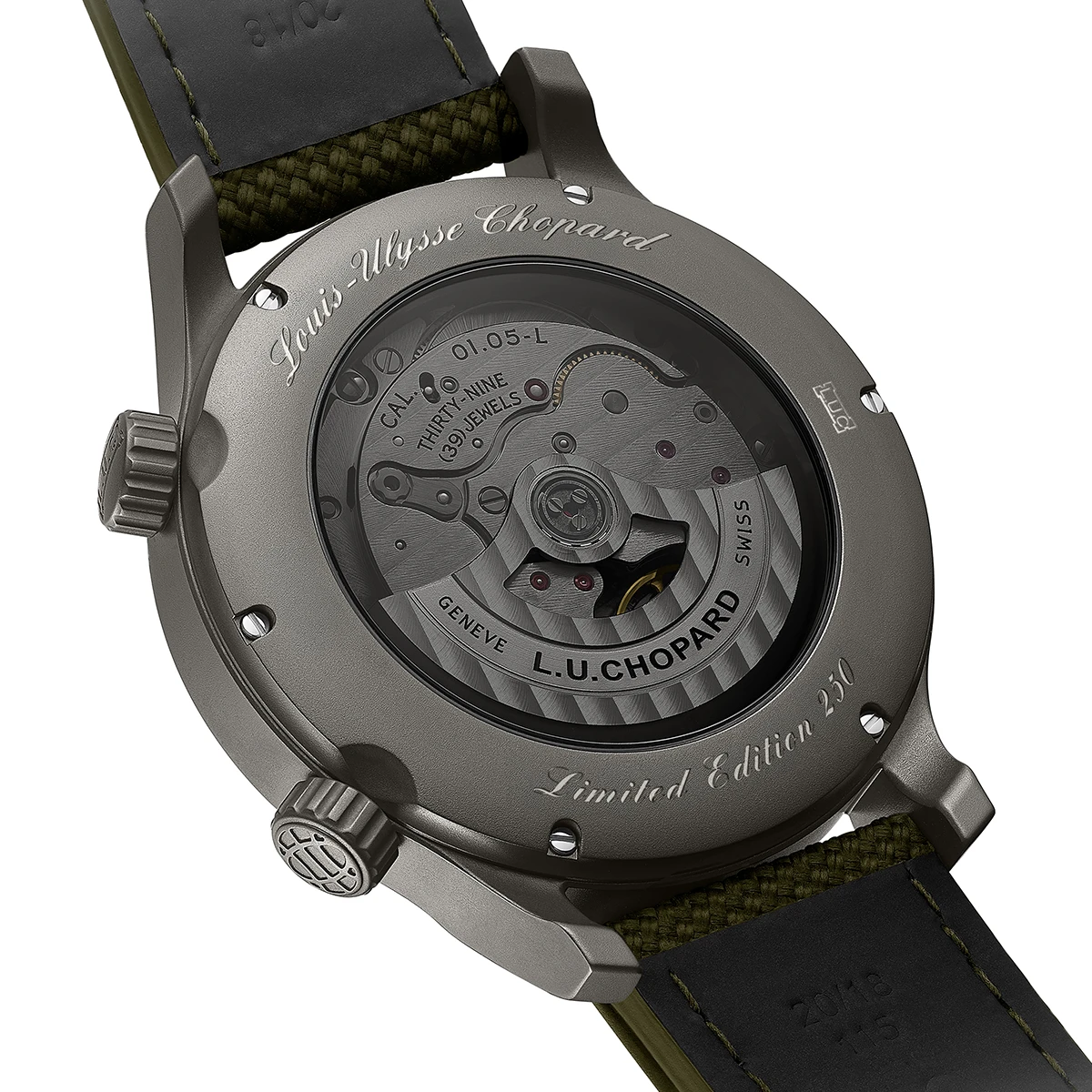 ショパールはこのセラマイズドチタンに新たな可能性を与えた。フィールドウォッチとしての装いである。本来、小傷に強いセラマイズドチタンはアウトドアで存分に使うべきケース素材だ。L.U.C タイム トラベラー ワンは新たにカーキカラーの文字盤をまとうことで、その可能性を実体化した。