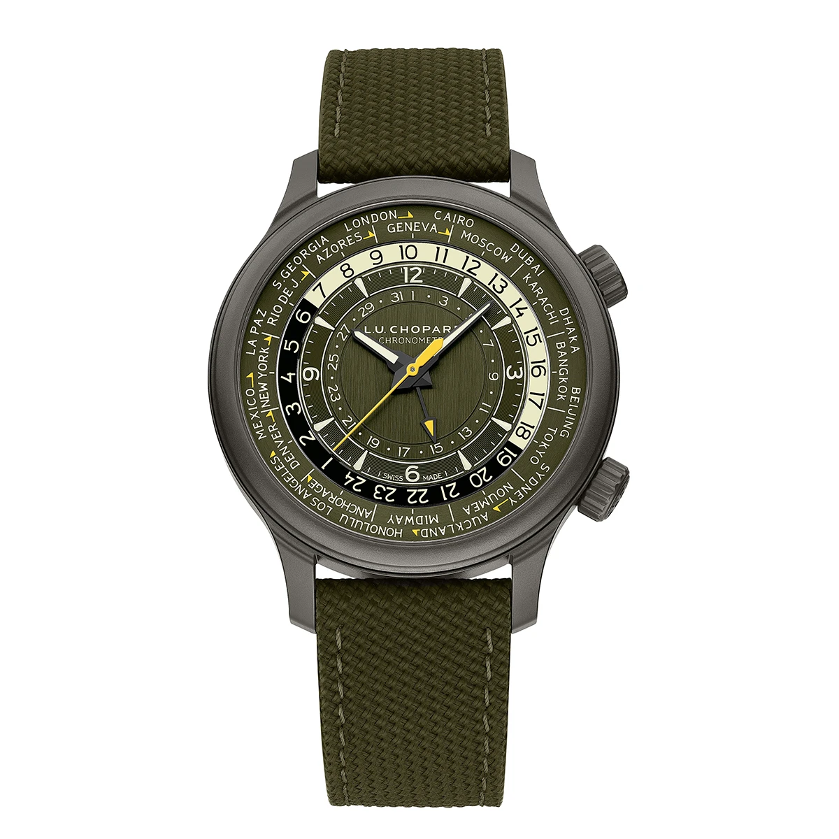 今回発表された新作から、もうひとつ「装い」への強い意識を感じさせるモデルを紹介しよう。それがカーキカラーを文字盤に採用したL.U.C タイム トラベラー ワンだ。