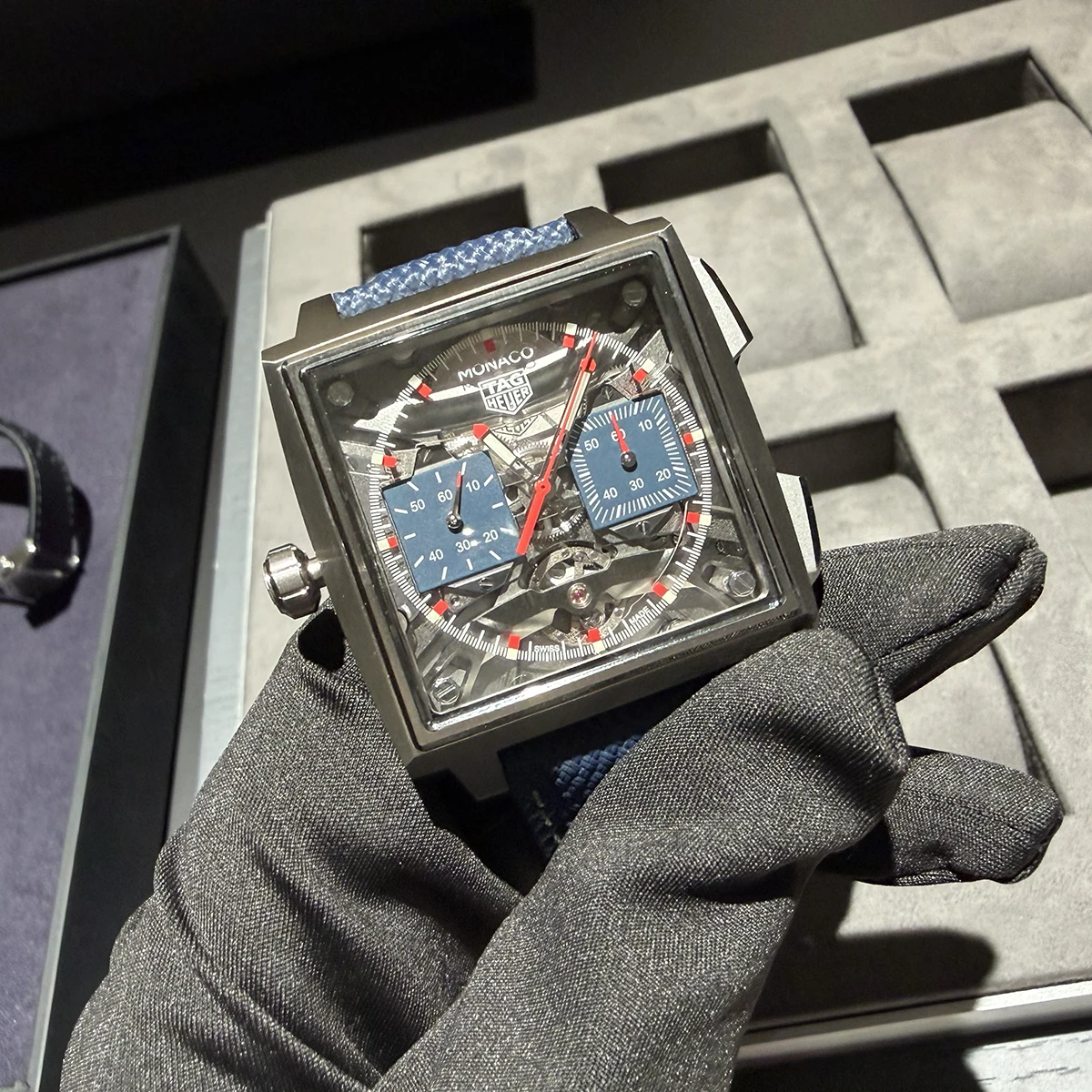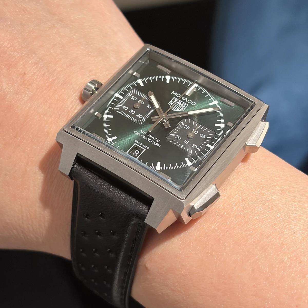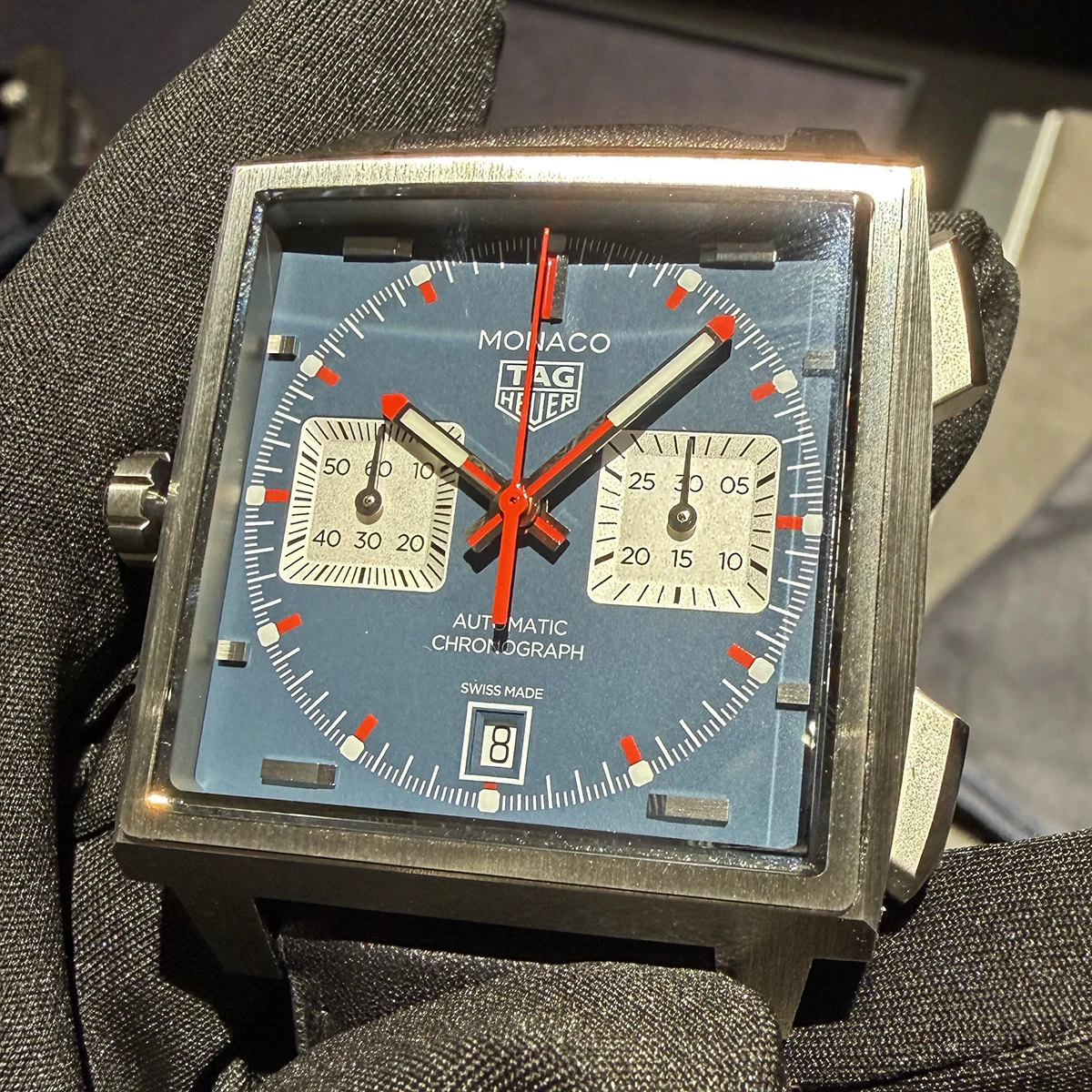 同時にリリースされた、新しい「タグ・ホイヤー モナコ キャリバー11」も撮影。往年の名作の雰囲気はそのままに、新しいCal.TH20-00ベースのCal.TH20-11を搭載している。キャリバーナンバーの末尾「11」は、キャリバー11から取られている。