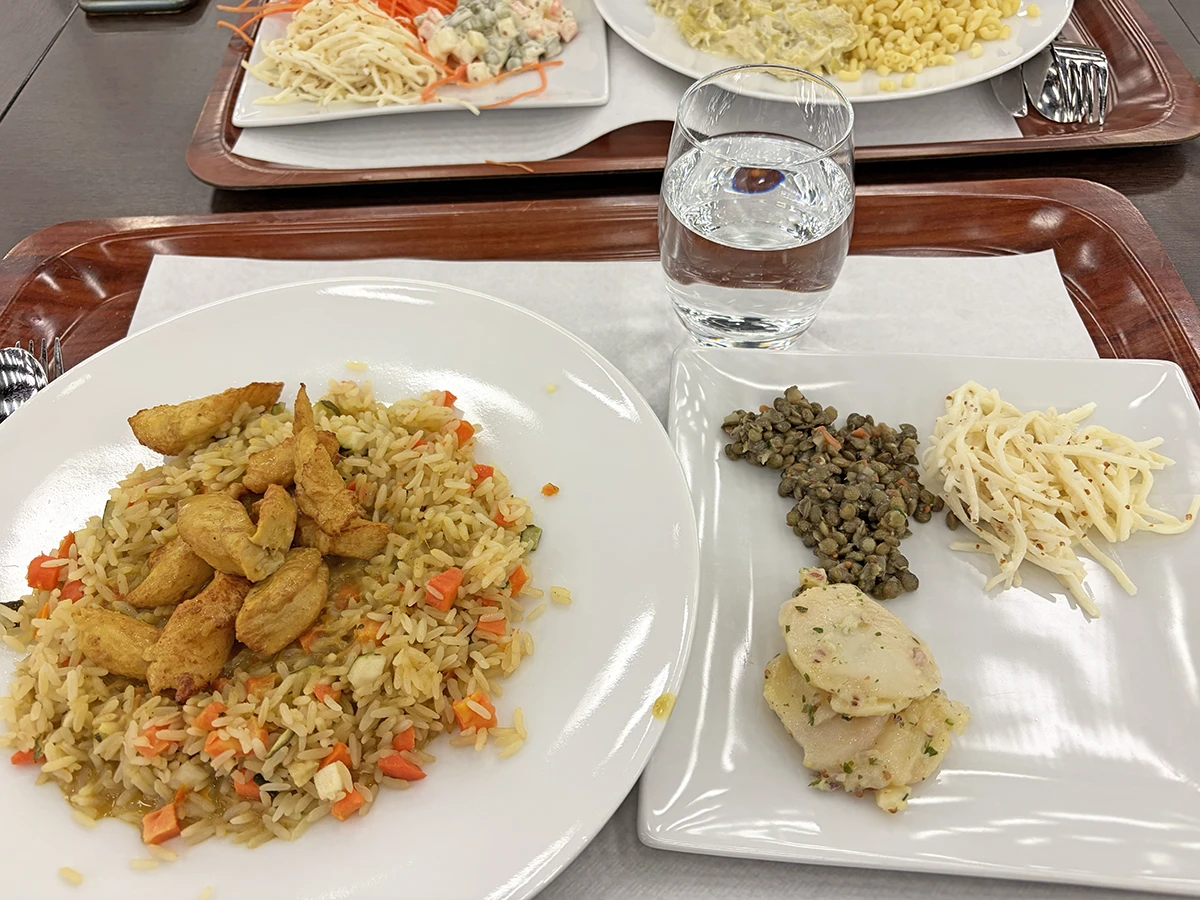 食堂ではサラダやハム、チーズ等がビュッフェ形式で用意されるほか、魚、肉、ベジタブルで選べるメインディッシュも食すことができる。私は肉を選んだところ、チキンカレーであった。野上氏は魚を選んでおり、そちらもおいしそうだった。「明日は魚にしようかなー」などと考えていたが、翌日以降、15時で閉まるこの食堂のランチに間に合う日はなかった。