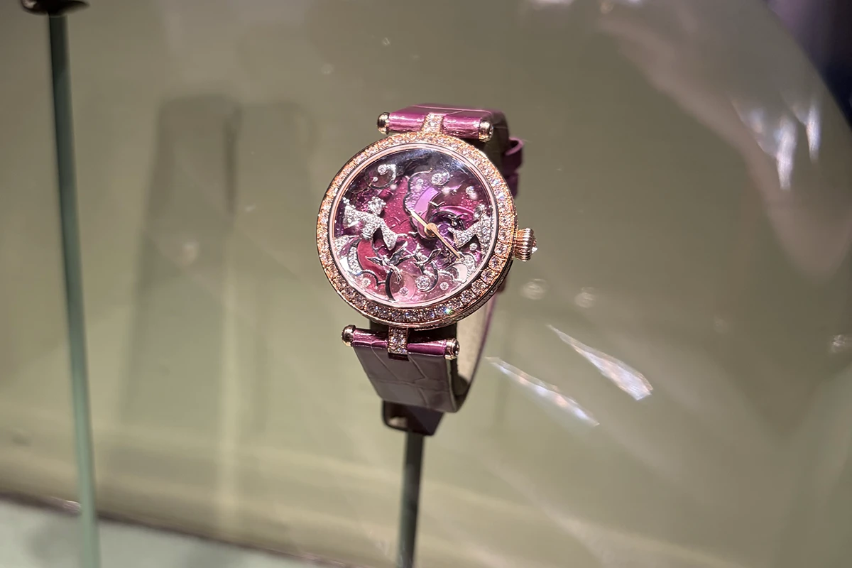実機を見ることはかなわなかったものの、「レディ ルトロヴァイユ セレスト」をショーケース越しに観賞することができた。「離れ離れとなった恋人たちの再会を待つ情景」がテーマとなっており、ホワイトゴールドの彫金による男女、そして鳥たちが文字盤を飾る。このストーリーの背景となるのは、シャンルヴェ エナメルで、さらにその上にプリカジュール エナメルで雲やベールが重ねられている。エナメル内部にダイヤモンドがセッティングされ、輝きを放つという発想にも驚きだ。