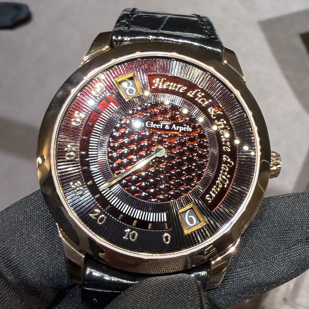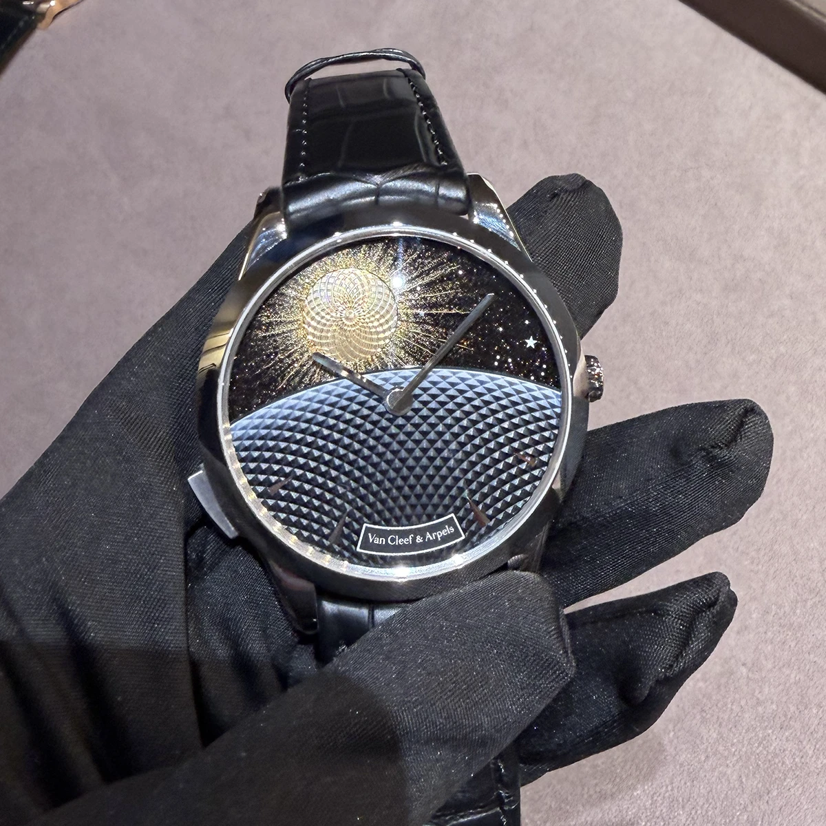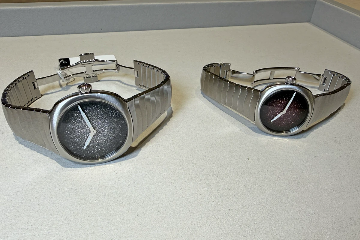 ブースにうっとりしていたところで、別部屋に案内され、「ミッドナイト ユール ディシ エ ユール ダイヨール ウォッチ」と「ミッドナイト ジュール ニュイ ファーズ ドゥ リュンヌ ウォッチ」を拝見。この文字盤、どうやって作っているの? という素人みたいな質問の仕方をしてしまうほど、見たことのないようなカラーや表現に息を呑む。