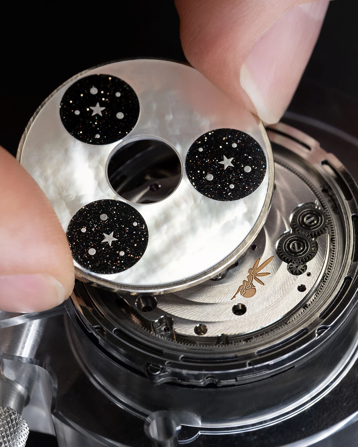 文字盤下に配されるムーンフェイズディスクはマザー・オブ・パール製だ。3つの開口部が設けられているのは、ムーンフェイズとデイ&ナイト表示を両立するため。文字盤は24時間に1回転、月相は24時間16分27秒に1回転させることで、ズレを生じないようにさせている。