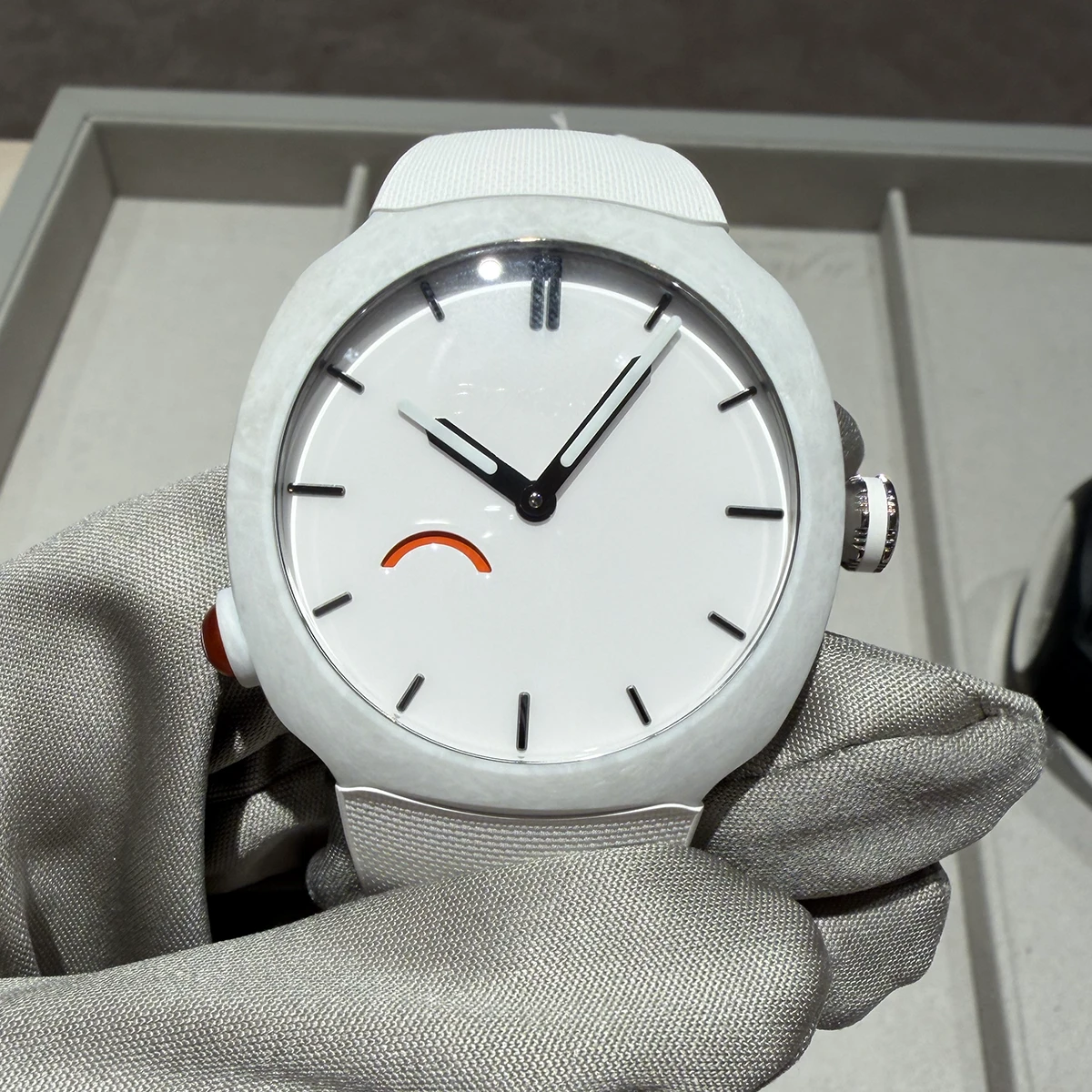 機構のユニークさに加えて、フォージド クォーツで製造されたケースをはじめとした外装が独創性にあふれている。ケースはマットである一方で文字盤はツヤによって光沢が出されている。なお、文字盤8時位置はパワーリザーブインジケーター。オレンジが巻き上げ残量。