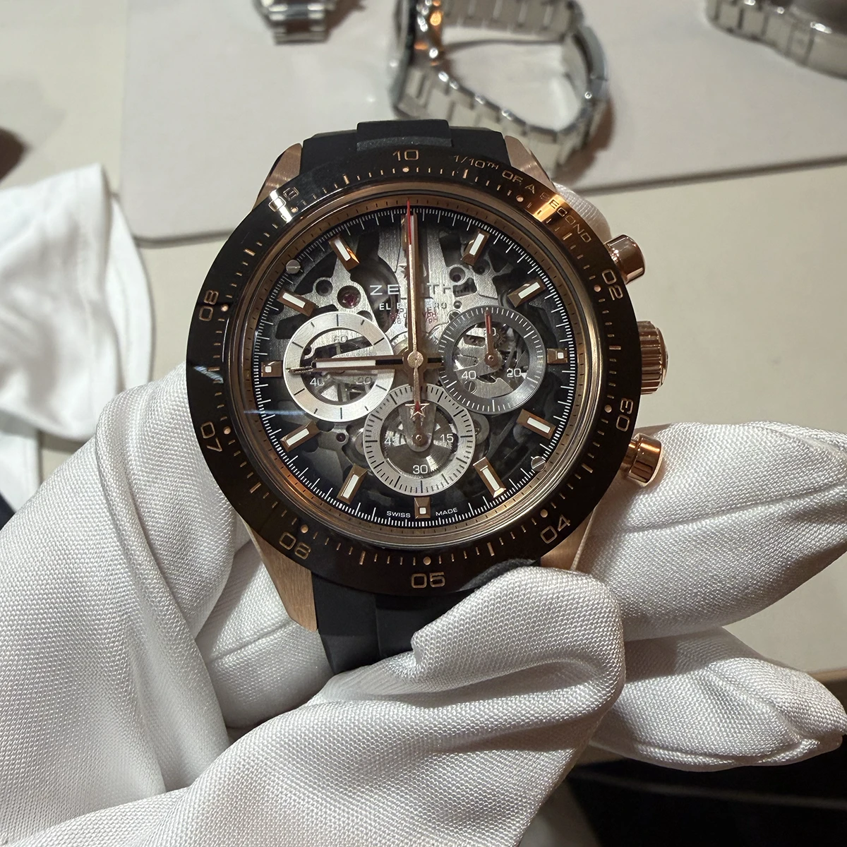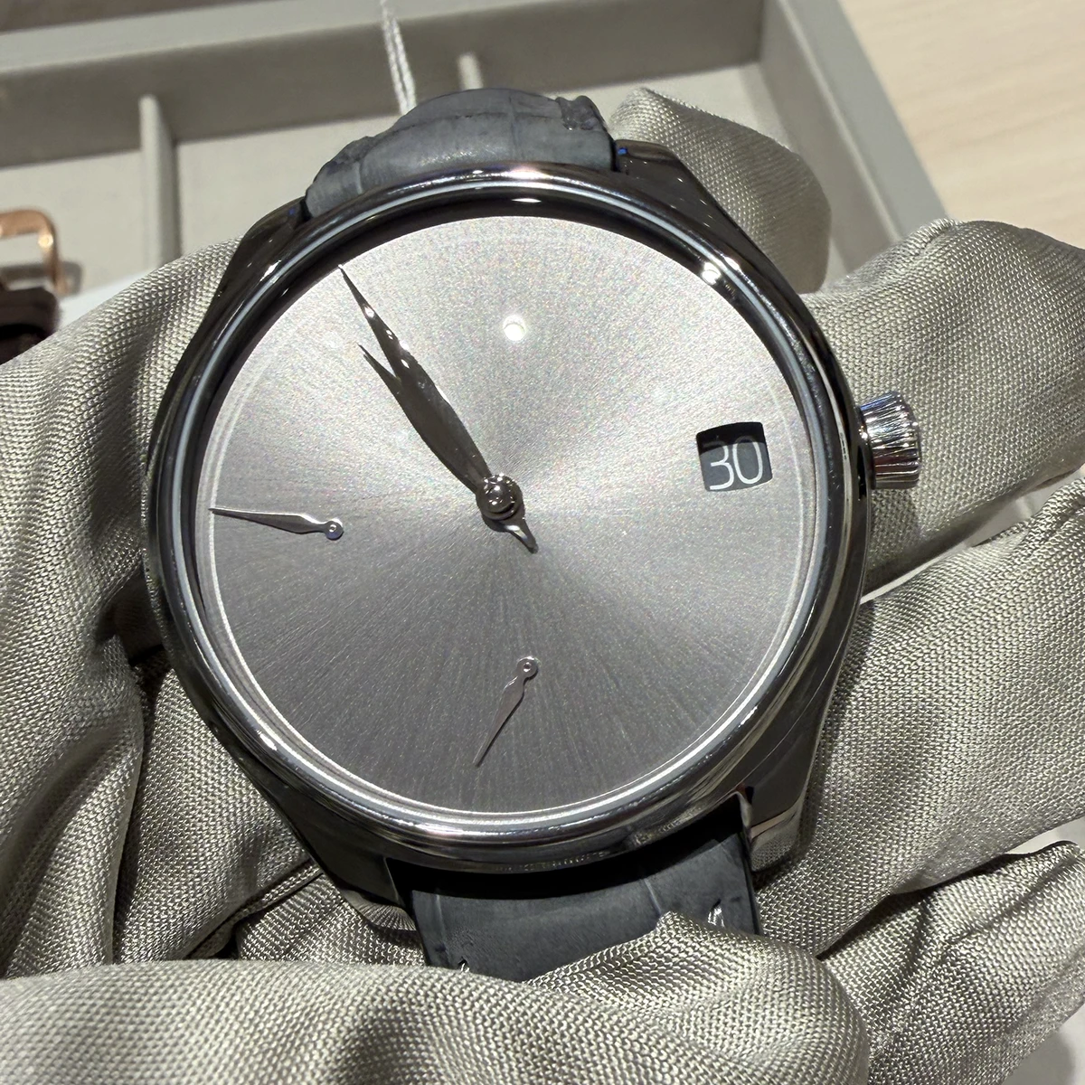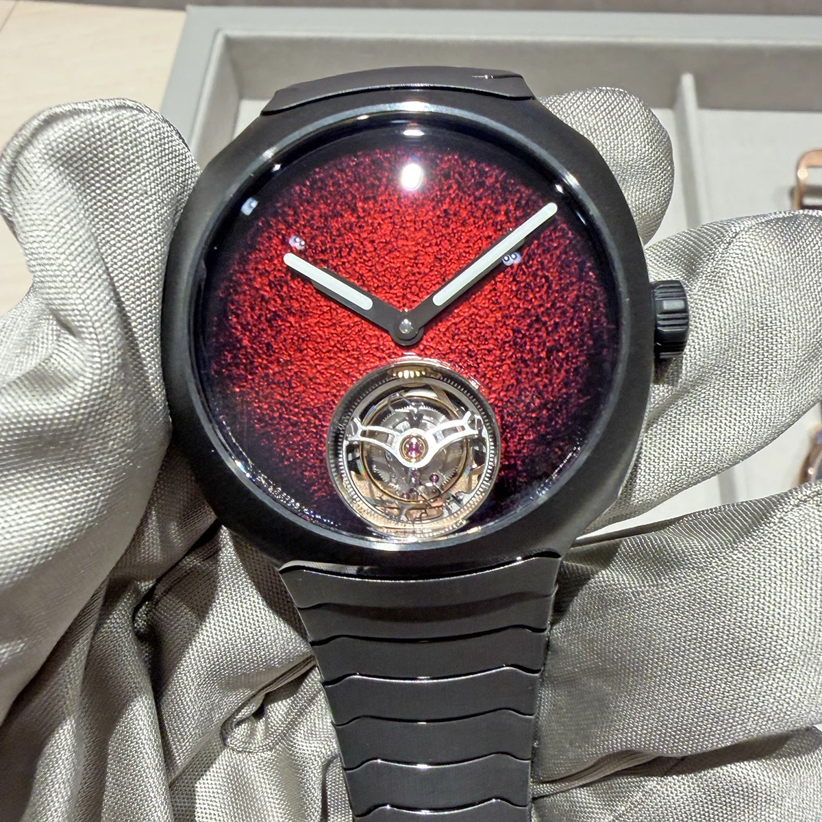 ブースをひと通り見た後、撮影ブースで実機取材&撮影。型破りなムーブメントもさることながら、外装もかっこいい。モダンにすることで、革新的な機構であることが強調されているようにも感じる。
