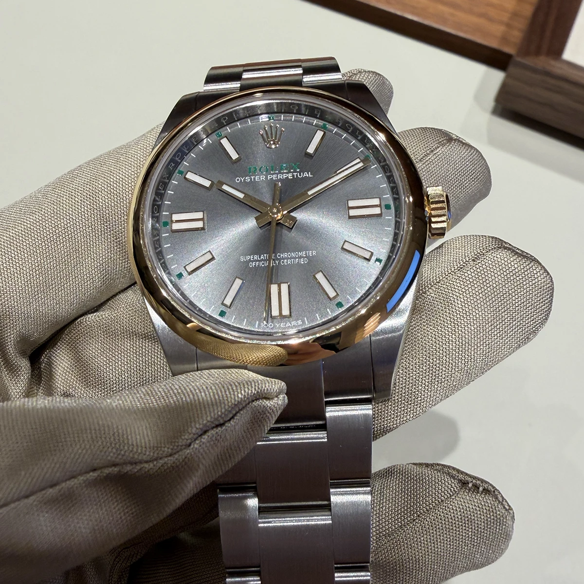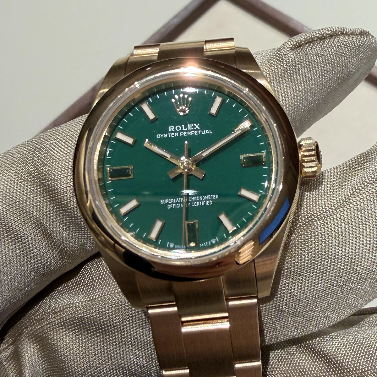 「オイスター パーペチュアル 28」の18Kイエローゴールドモデル。文字盤はグリーンストーンカラー。名称に“ストーン”とあるものの、ラッカー仕上げ。しかしその色は濃く、天然石を使っているかのようだ。