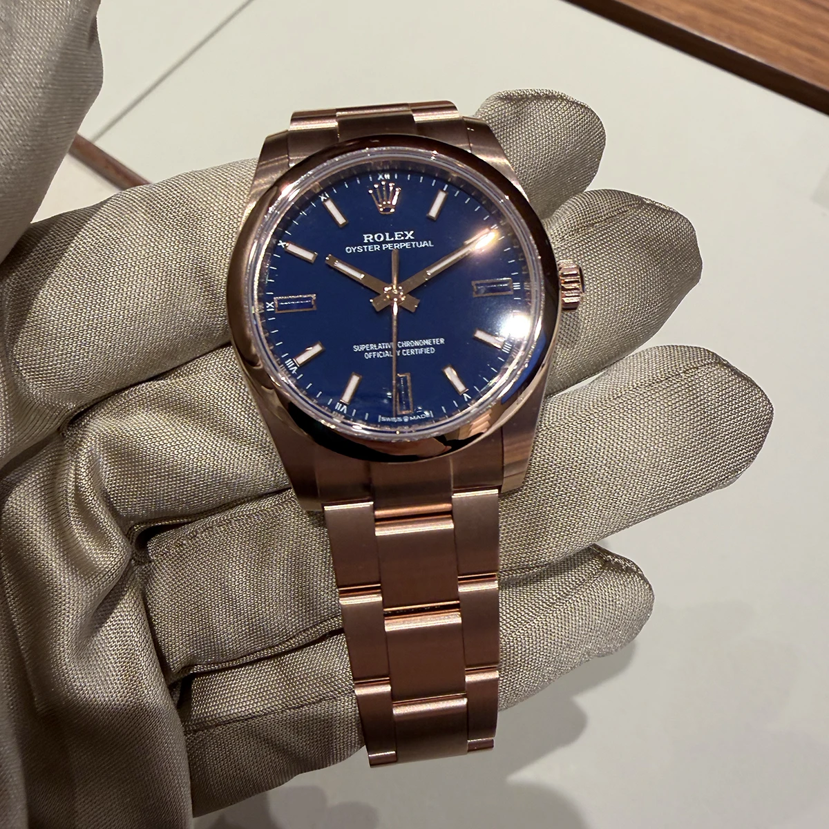 「オイスター パーペチュアル(確か34mm)」の18Kエバーローズゴールドモデル。これまた文字盤はラッカーによって表現されたブルーストーンカラー。3・6・9のインデックスにはデュモルチェライトなる鉱石が配されている。このインデックスはオジーヴカットによって、天面にファセットが与えられていることも特筆すべき点だ。