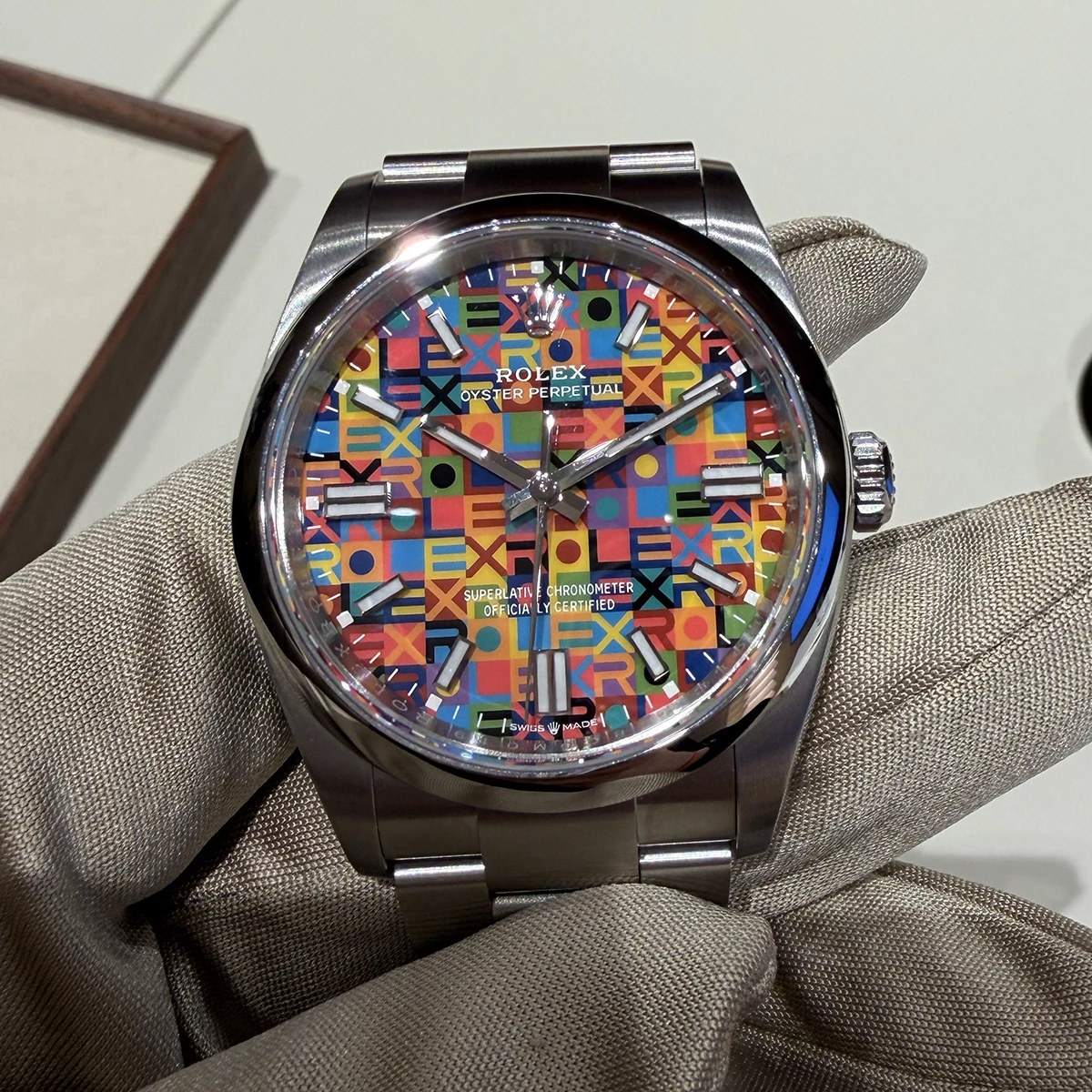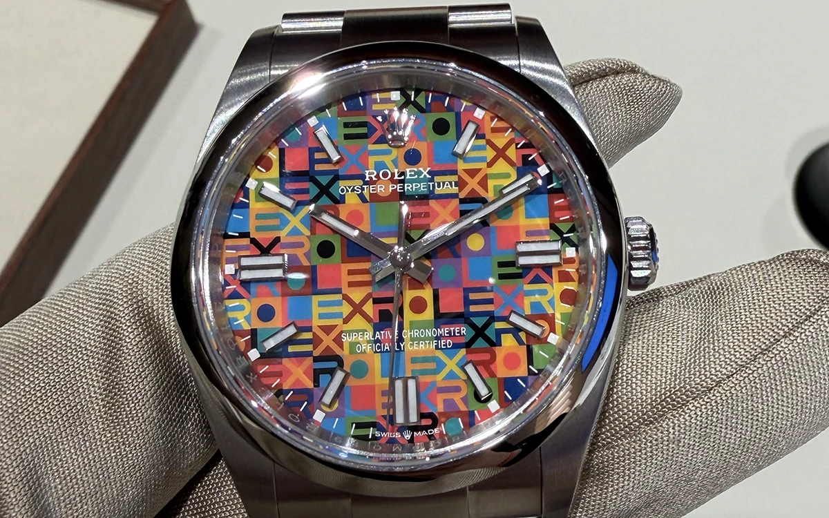 1970年代末にあった“ジュビリーモチーフ”を、パッド印刷によってあしらった「オイスター パーペチュアル 36」。こんなに細かくモチーフやカラーを、こんなに小さな文字盤に描くことができるのか……。見た瞬間「どうやって作っているんですか?」と思わず聞いてしまう。