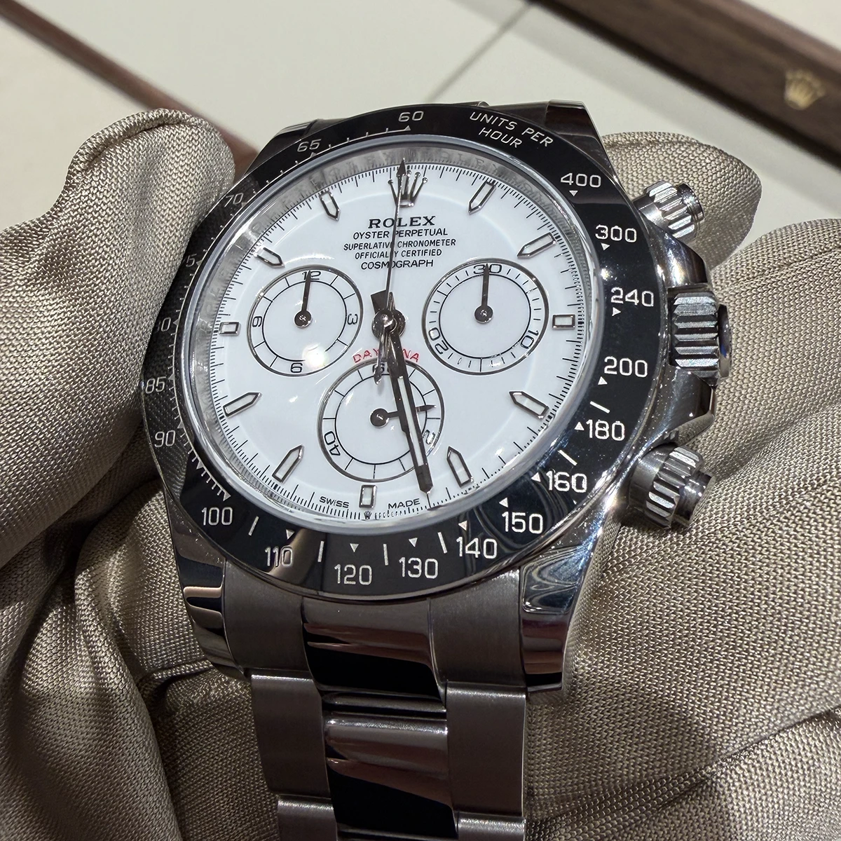 新作「オイスター パーペチュアル コスモグラフ デイトナ」。初となるグラン フー エナメル文字盤が特徴的。インダイアル部分に段差が設けられている。エナメルの光沢と相まって、高級感は抜群だ。