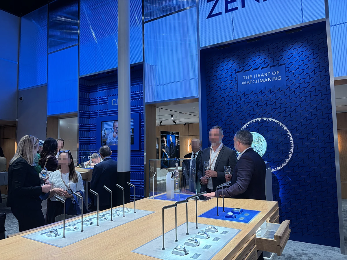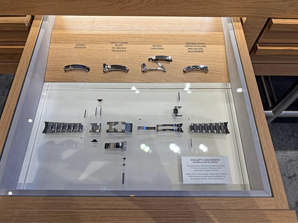 ゼニスのブースは青一色! そこまで大きくないものの、新作時計に関する技術的な仕様やパーツの展示が多く、ブースを見て回るだけで勉強になった。