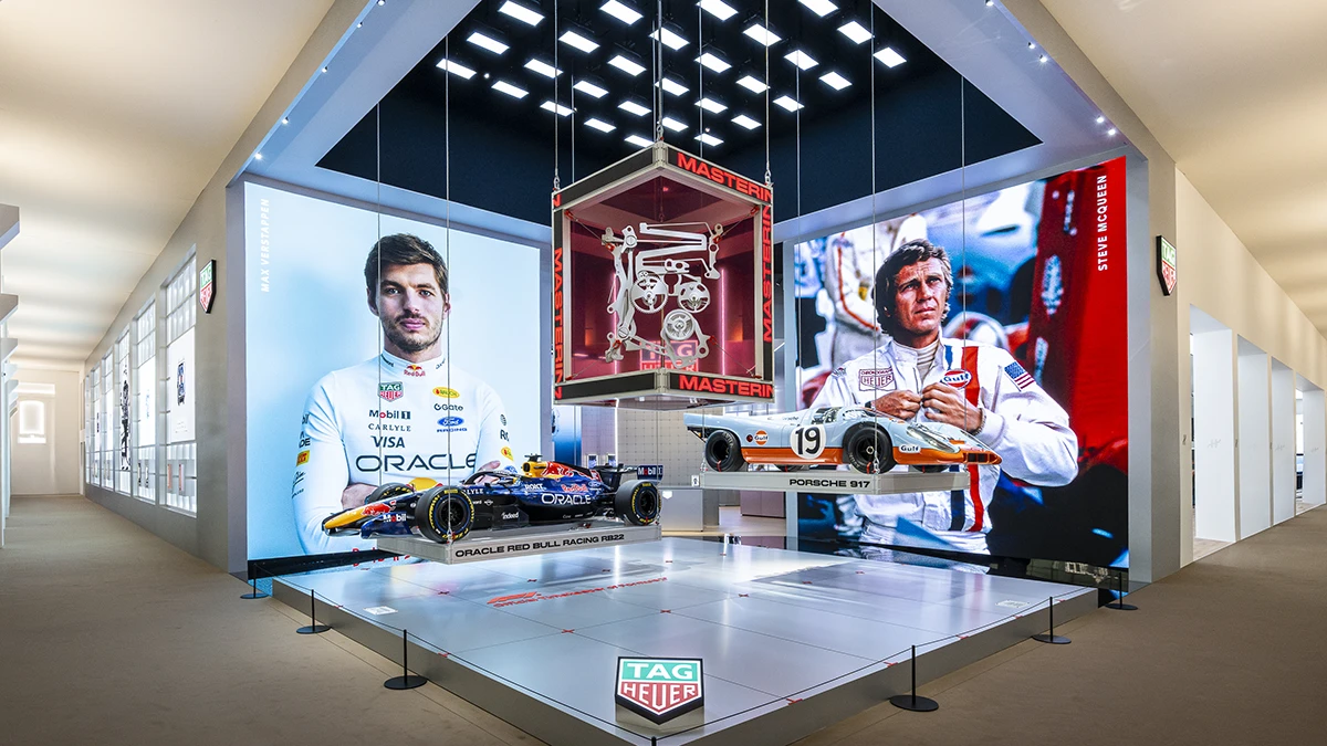 このふたつのレーシングカーに挟まれて掲げられているのは、2026年にタグ・ホイヤーが打ち出した、新型クロノグラフムーブメントだ。