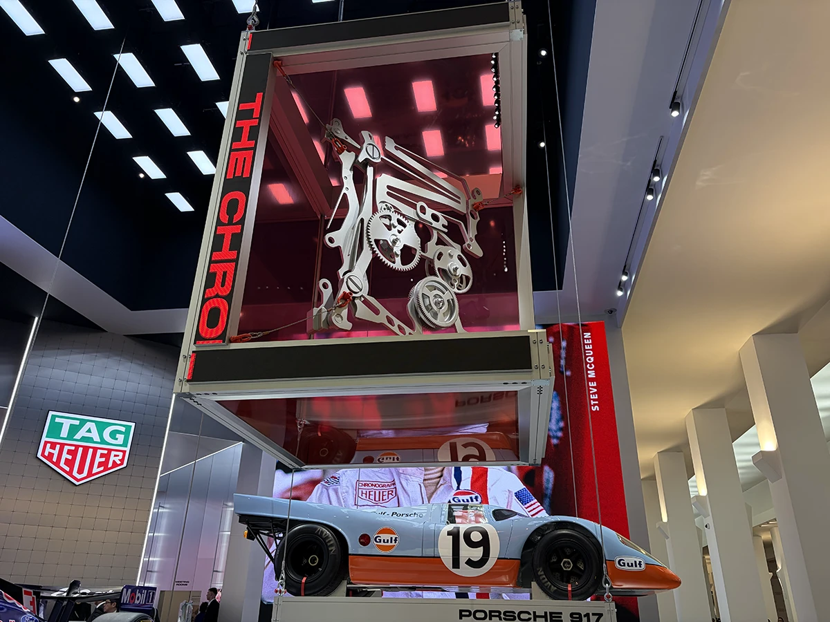 同ブランドのブースを訪れると、2台のレーシングカーがお出迎え! ひとつはオラクル・レッドブル・レーシングのF1カー、もうひとつはスティーブ・マックイーンが実際に映画『栄光のル・マン』で運転していたという「ポルシェ917」だ。
