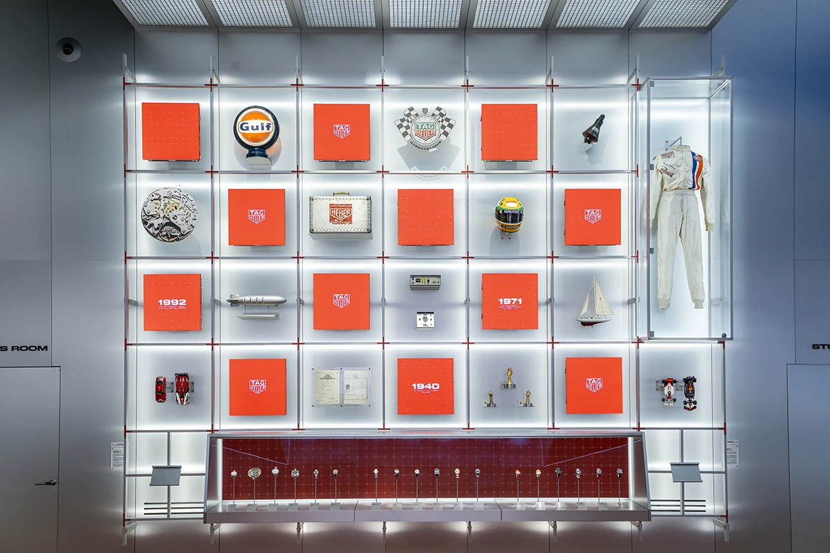 このスペースではタグ・ホイヤーのクロノグラフの歴史やレーシングスピリットを象徴する展示品の数々が用意されており、時計好きのみならず、車好きも垂涎の空間となっていると言える。