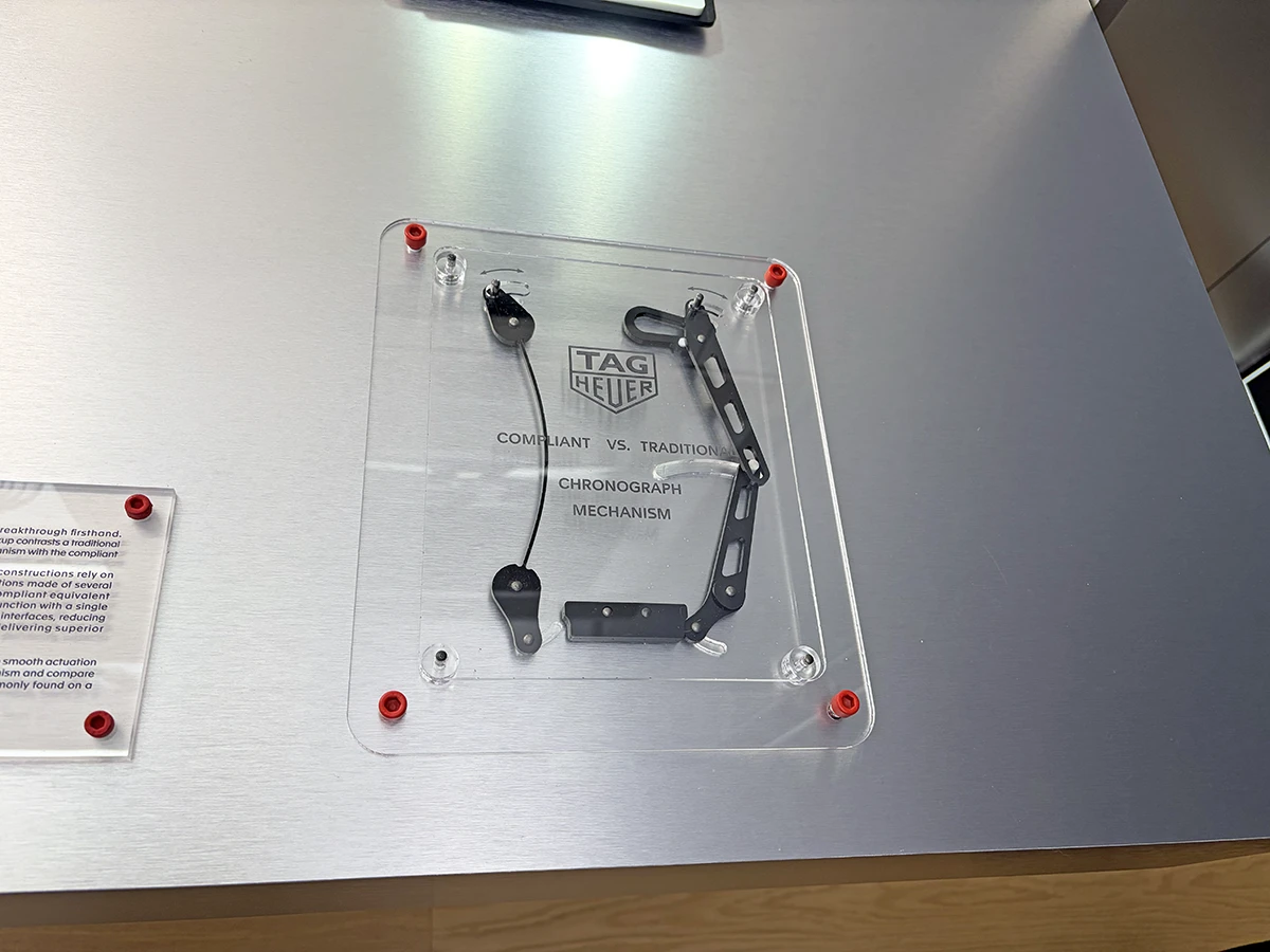 Cal.TH80-00の肝となる「コンプライアント クロノグラフ機構」。柔軟性のある素材で作られた“双安定部品” (写真左)をふたつ組み込み、一方がクロノグラフのスタートとストップを(左側の部品)、もう一方がリセットを担うことで、クロノグラフに不可欠であったレバーやバネ、コラムホイール(あるいはカム)が不要となっている。この素材はテレフォンカードのように曲げても折れずに柔軟に湾曲する。なお、LIGAで製造された、精密な部品だ。でも写真右側の、従来のスタート・ストップの模型を作動させるのも結構面白く、何度もやってしまった。