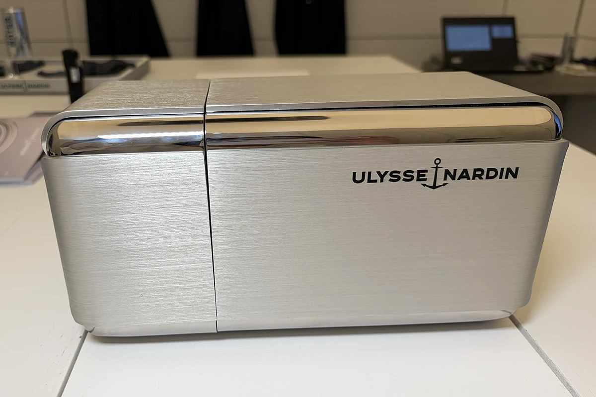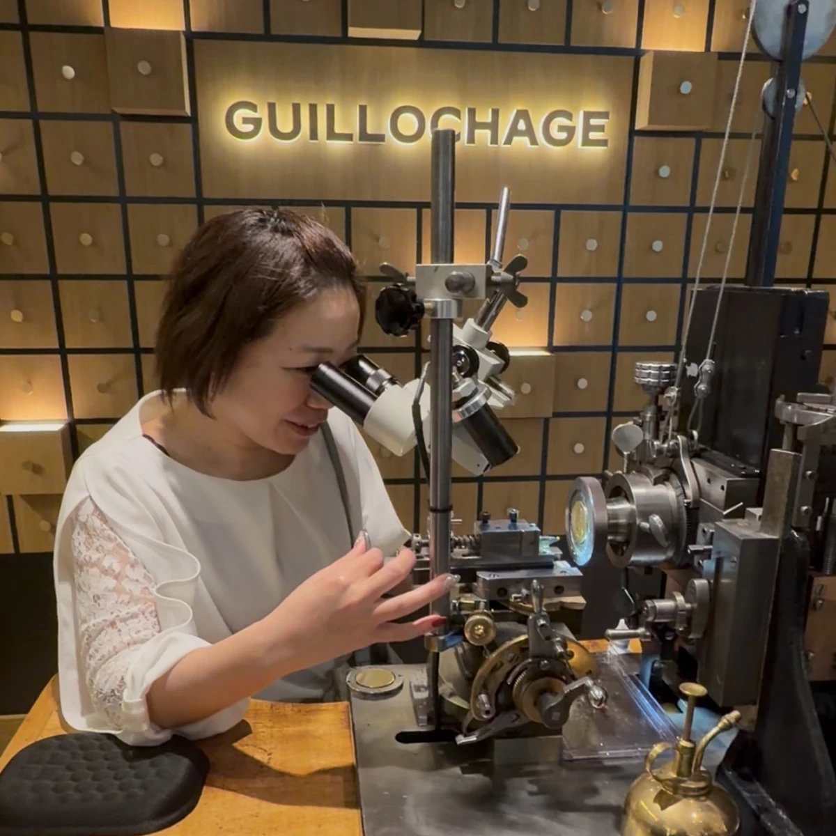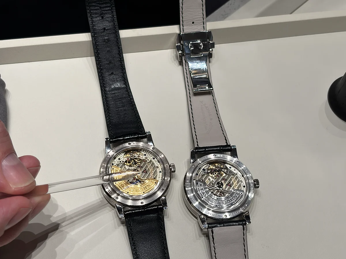 さておき、クロノスイスへ。クロノスイスでもギヨシェマシーンが置かれており、職人が教えてくれながら体験できるワークショップを行っていた。私はすでにジャガー・ルクルトで体験していたので説明を聞くにとどめていたが、なんと説明してくれた職人が、同ブランドでギヨシェおよびエナメルを手掛けるMaik Panziera氏であった。なぜ「なんと」なのかと言うと、以前『クロノス日本版』2024年1月号の新鋭で「デルフィス」について取り上げた際、実機を撮影中にエナメル文字盤がドーム型に湾曲しており、「ここにエナメルを施すのは大変だろうな」と思って調べると、クロノスイスではかつてファベルジェのエナメルを手掛けていた職人がいて、その彼がエナメルを担当していると聞いていた。その元ファベルジェ職人がPanziera氏であったのだ。