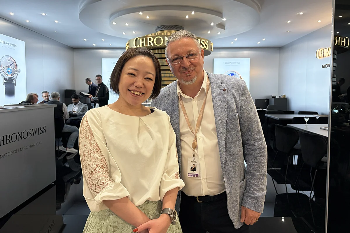 広田がデ・ハス氏にいろいろ質問していて、勉強のために聞いていたかったが次のアポイントメントがあるのでブースを出る。ブース前で本誌チームの副編集長・鈴木幸也とフォトグラファーの三田村優氏、高橋敬大氏と遭遇。三田村氏は毎年のようにスイスの新作見本市取材の撮影を担当してくれているので、もはやブースの場所をほとんど覚えており、私が「クロノスイス! クロノスイス!」と叫んでいると「あっち側ですよ」と教えてくれた。写真がうまい、イケメン、人柄も良いとか、漫画の主人公かな?