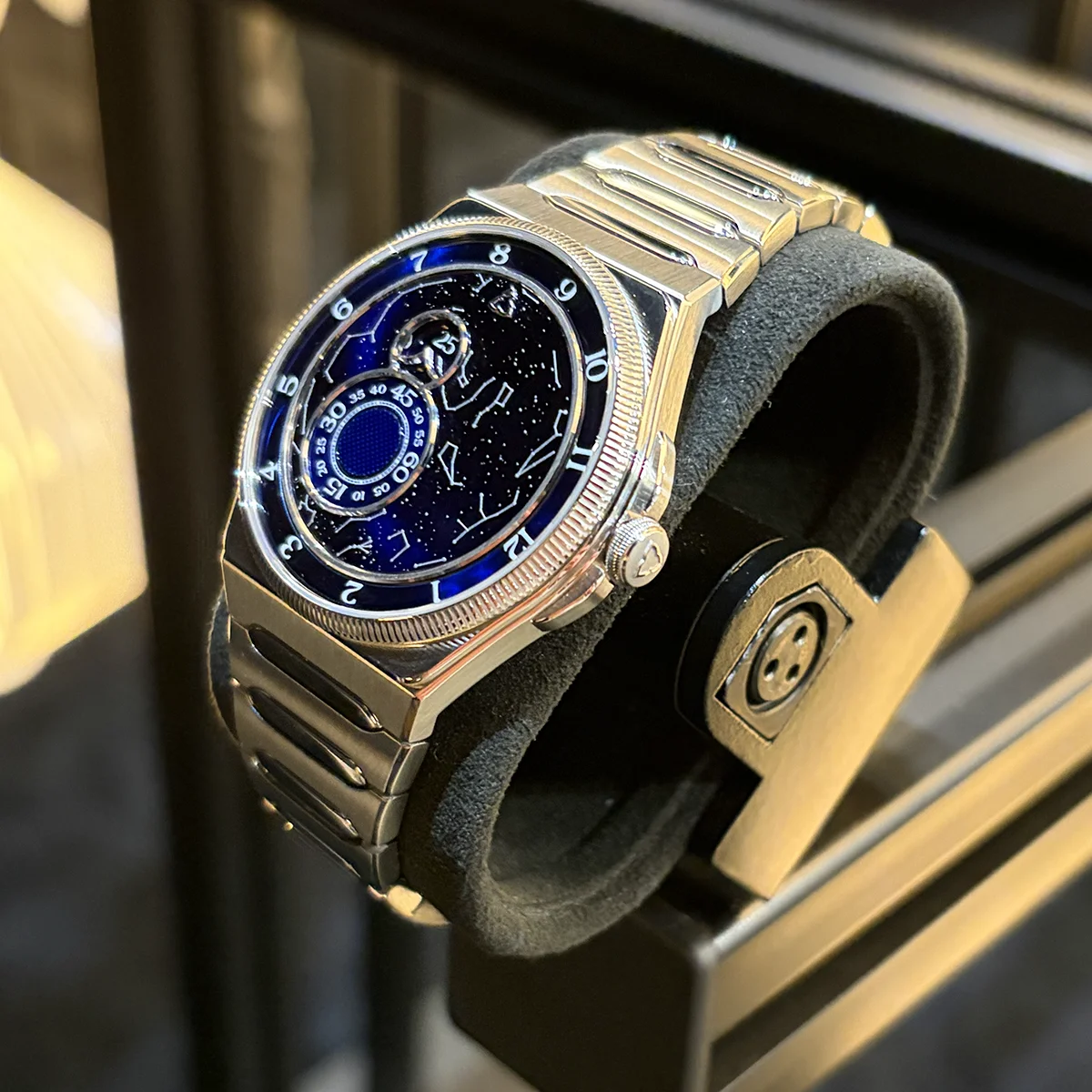 前述の通り、今年のユリス・ナルダンは何もかもが型破りだ。ブースデザインのみならず、その破天荒さは新作時計にも表れている。「史上最も複雑なタイムオンリーウォッチ」として発表された「スーパーフリーク」は、時刻表示のみならが、カルーセル機構とダブルフライングトゥールビヨンを併催させているのだ。