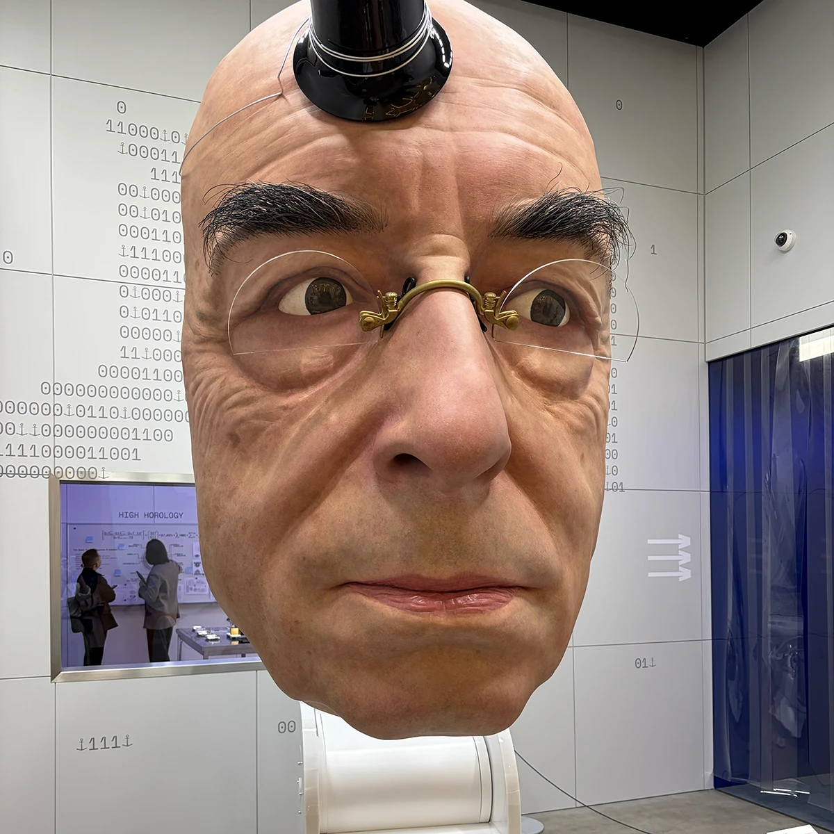 取材まで時間があったので、改めて会場内の各ブースを見て回る。大小はあれど、各社の“色”の出た、創意工夫にあふれるブースは、外観・内装ともに面白く、見ていて飽きない。とりわけ印象に残ったのがユリス・ナルダンだ。同ブランドを代表するコレクション「フリーク」25周年にあたり、自社の歴史にスポットを当てた展示が用意されており、その一環で来場客から最も目立つホールに面したスペースに、ルートヴィヒ・エクスリン博士の顔の像が鎮座していたのだ。また、ユリス・ナルダンがなぜか2体のロボット(?)を会場内に放っており、縦横無尽に走り回っていた。