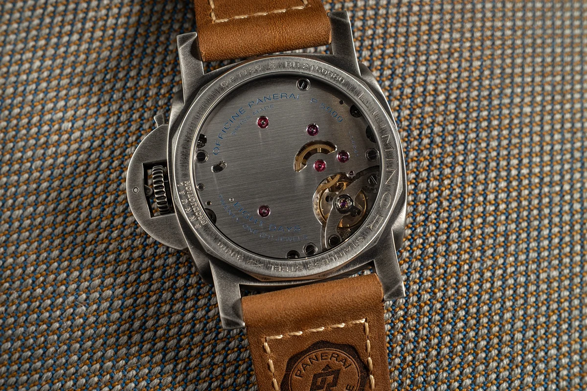ケースバックからの眺望にも同様のコントラストが見られるが、こちらには直線のヘアライン仕上げが多く施されている。搭載されているのは手巻きのパネライ自社製Cal.P.5000であり、ふたつの香箱によって約8日間という長大なパワーリザーブを誇る。今年6月発売予定である。