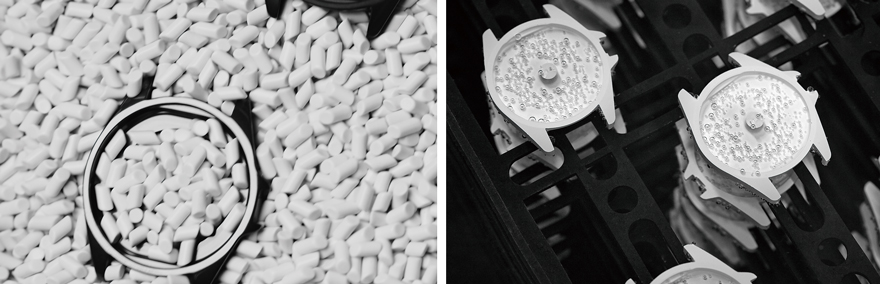 G&F シャトランのお家芸であるセラミック製のケース製造も従来に同じだ。ケースの素材となるのは、酸化ジルコニウムの塊を潰して粉末状にした粒子である。そこに有機バインダーを混ぜてペースト状にして、このペーストを40t/㎠の圧力で金型に注入して固める。その後、溶剤に浸して有機バインダーを取り除いて焼結させれば、大まかな外装の完成となる。バリ取り、正確なサイズを与えるための研削、研磨、そして艶出しを経て、セラミック製の外装は完成する。これらの作業には2日間を要するが、最も重要な艶出しには10時間から12時間かかるとG&F シャトランの関係者は語る。「大事なのは磨き粉にあたるポーターと水、そして温度。ノウハウだから重要な部分は言えない」。詳細は不明だが、J12のセラミック製の外装が貴金属のような光り方をするのは、このノウハウがあればこそ、である。