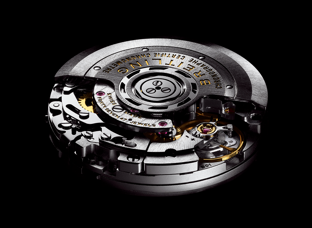 垂直クラッチを採用するブライトリングの自社製自動巻きクロノグラフムーブメント、Cal.01。組み立て時の個別調整が必要ないリセットハンマーやモジュラー構造など、大量生産に適した現代的な設計を持つ。クロノグラフとしての実力はもちろんのこと、約70時間のパワーリザーブや修正禁則時間帯を持たないカレンダーなど、使い勝手に優れる。自動巻き。部品数346。47石。2万8800振動/時。パワーリザーブ約70時間。30分、12時間積算計。直径30mm。厚さ7.20mm。コラムホイール制御。