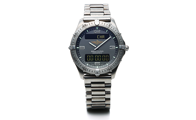 1979年にスタートを切った新生ブライトリングにおいて、中興の祖、アーネスト・シュナイダーが矢継ぎ早に放ったコレクションのうち、「ナビタイマー」、「クロノマット」に続いたのが、当時の最新技術を盛り込んだ「エアロスペース」である。クォーツ式のデジアナ表示で、現在でも根強くファンに支持されている時計だ。