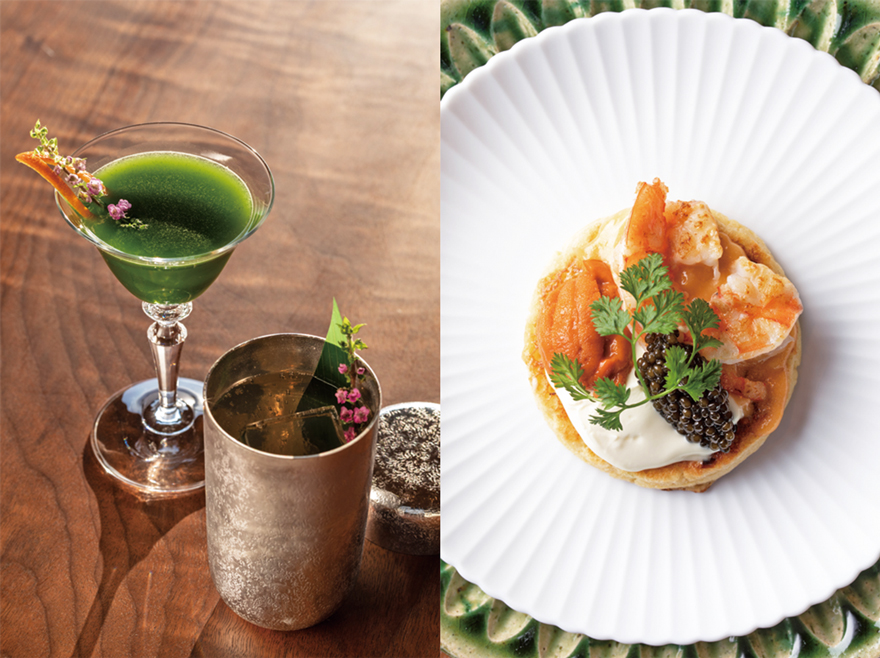 バー「琥珀」のシグネチャーカクテル「琥珀ジントニック」は、東山の井戸水を使用した京都蒸留所によるオリジナルのクラフトジン「青龍」を使った一杯。京番茶で濾すことで、ふんわりと香りを纏って注がれる。このようなさりげなく、漂うようにちりばめられた京都らしさが心地よい。客室に備えられた唐紙師「雲母唐長(きらからちょう)」によるオリジナルのレターセットや、スパで使用するオーガニックコスメブランド「KOTOSHINA」。アーティストや職人による作品も随所に置かれ、いずれも奥ゆかしい。また、ライブラリーや客室に置かれた本は、並び順はもちろんのこと、開かれた頁まで定められている。そのような徹底した美学が「パーク ハイアット 京都」を形成している。