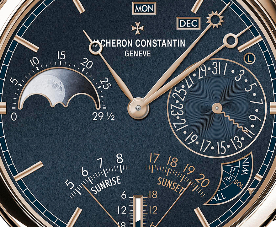 前述のようにミニッツリピーターに加え、同作にはムーンフェイズ付きのパーペチュアルカレンダー、日の入り・日の出、現在時刻、恒星時間、そのほか天体系の星座、四季、夏至・冬至、春分・秋分表示などが含まれている。
