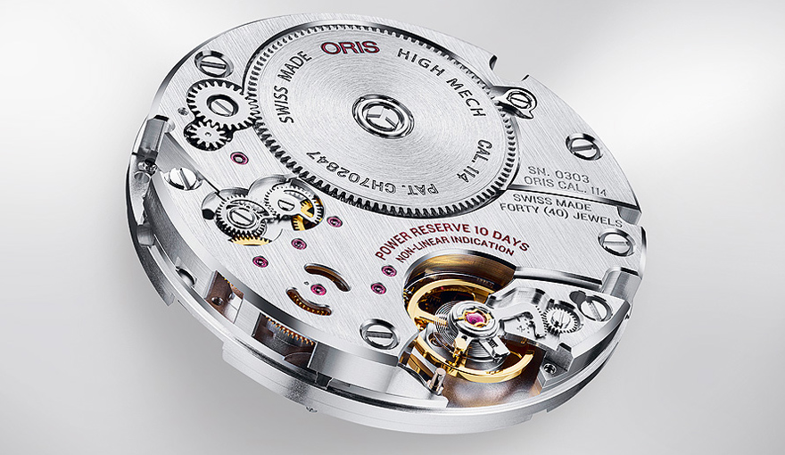一定の速度で稼働しないパワーリザーブ表示の技術には、螺旋状のふたつの歯車が関係している。それぞれが反対方向に回転することでポインターが望みのスピードで運針するというものだ。オリスはÉcole Technique Le Locleと協力し、約10日間のパワーリザーブを表示するカスタムメイドのカムシステムを10年かけて開発した。安定したレートカーブを実現するためには、大きな香箱と小さなテンプの間の動力連携を綿密に計算する必要があったのだ。