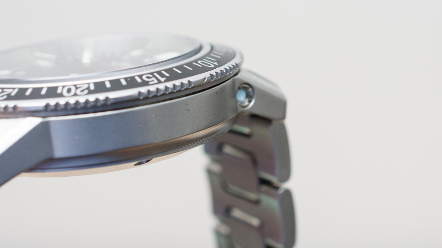 また、リュウズのねじ込み部は精度が高く、締め込み時のかみ合わせが良い。さらに、リュウズの引き出しのクリック感が明瞭で、その操作感は(私が所有する他のETA2824-2搭載機と比べて)巻き芯の遊びが小さく、しっとりとしている。この辺りは500m防水に対応するためのOリングの密着度が高いことが関係しているのかもしれない。