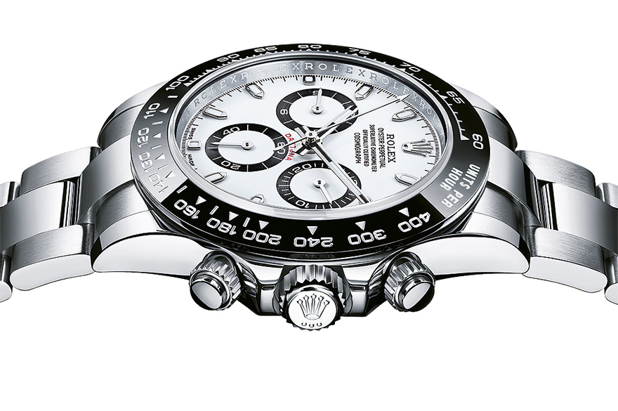 両モデルとも、ケースとブレスレットはステンレススティール製。ロイヤル オーク クロノグラフが38mmと41mmの2サイズを展開する一方、「デイトナ」はその中間の40mmだ。ケース厚ではオーデマ ピゲに分があり、その厚さはわずか11mmと、ロレックスよりも1.5mm薄い。ただしロイヤル オーク クロノグラフの防水性能は50mで、ロレックスの200mよりもはるかに下回る。さらに、傷が付きにくいセラミックス製ベゼルが「デイトナ」をより耐久性のある時計にしているのだ。デイトナが採用するねじ込み式のプッシュボタンも、耐久性に貢献している。ロイヤル オーク クロノグラフではリュウズのみがねじ込み式だが、それはつまり、クロノグラフの操作がスムーズに行えることを意味している。