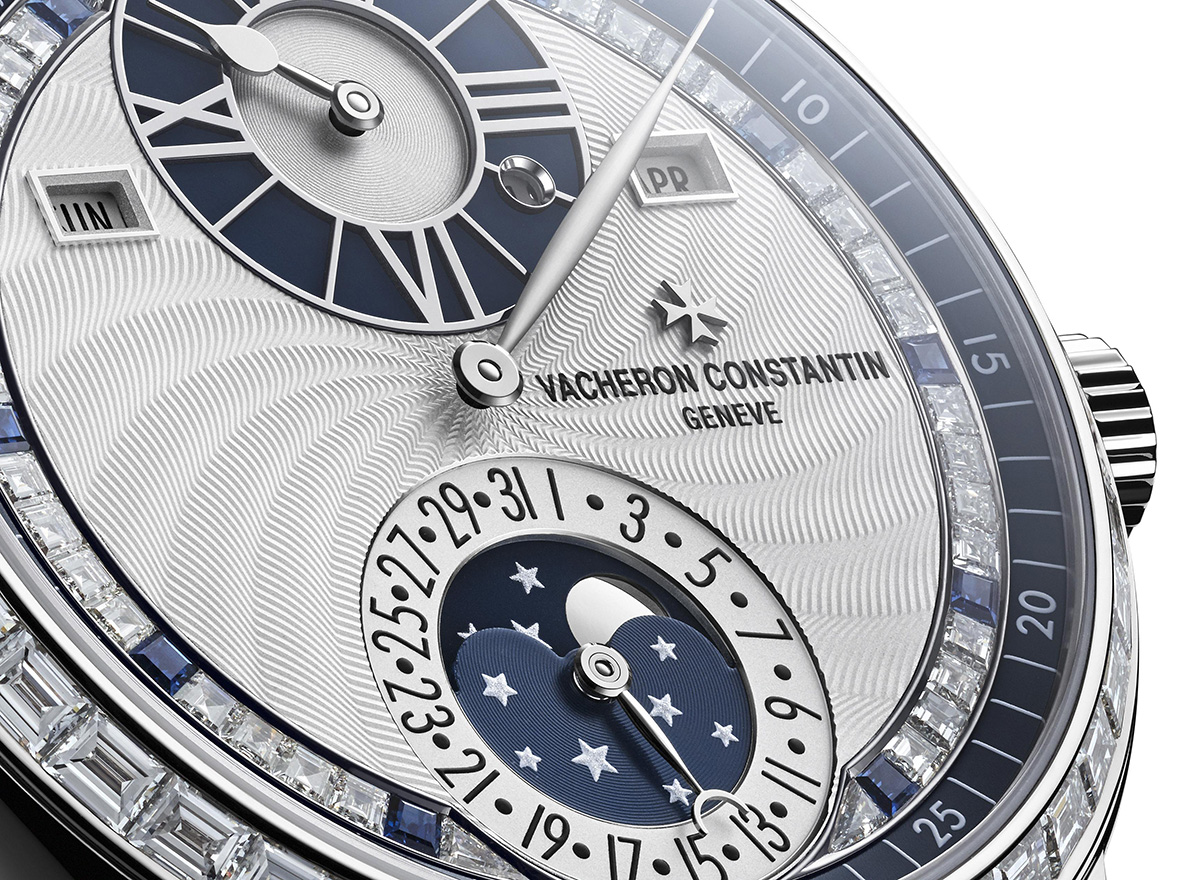 「レ・キャビノティエ・レギュレーター・パーペチュアルカレンダー ムーンライト・ジュエリー・サファイア」は、レ・キャビノティエ部門が手掛けるユニークピースだ。時・分・秒針を別々の軸に取り付けたレギュレーターに、パーペチュアルカレンダーとムーンフェイズが備わっている。ダイアル中心には手作業による螺旋模様のギヨシェ彫りが施され、その周囲を合計46個のバゲットカットダイヤモンドとサファイアが彩っている。バゲットカットダイヤモンドはベゼルのほか、クラスプにもセットされており上品なきらめきを添えている。かつて天空や天体の軌道を観測するために開発されたマスタークロックに通じるレギュレーター表示に加え、パーペチュアルカレンダー、西暦2100年まで修正不要な高精度ムーンフェイズを搭載した今作は、時間計測の起源である天体観測に敬意を表したモデルだ。
