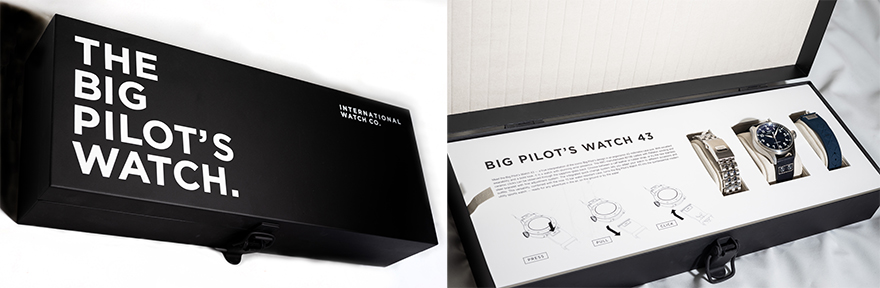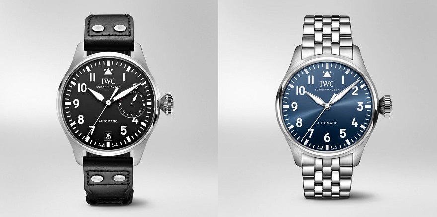 (右)新しく追加された「ビッグ・パイロット・ウォッチ 43」(IW329304)。Cal.82000系を採用し、インナーケースを省くことで直径43mmとなった。これはブレスレット仕様。ほかにもカーフスキンストラップのモデルがある。自動巻き(Cal.82100)。27石。2万8800振動/時。パワーリザーブ約60時間。フリースプラングテンプ。SS(直径43mm、厚さ13.6mm)。10気圧防水。118万2500円(税込み)。