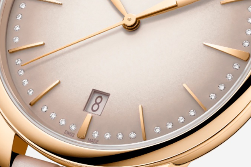 それ以外のディテールも凝っている。外周部のミニッツインデックスは、完全なカボションか、ダイヤモンド埋め込み(!)。どうやって実現したのは不明だが、とても魅力的なディテールだ。ちなみにダイヤモンド埋め込みのミニッツインデックスは、すでに「パトリモニー・オートマティック」の女性用(直径36.5mmだが、本作とはケースデザインやディテールが異なる)が採用したものだ。おそらく仕上げそのものは同じだろうが、文字盤外周の色を落とすことで、ダイヤモンドが一層際立っている。