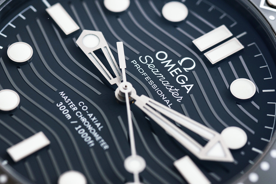 シーマスター ダイバー300Mのアイコンの波模様のダイアルは、今作ではわずかにグレーがかったマットなベースに、艶のあるブラックの細い模様が刻まれたものだ。このダイアルの視認性が極めて高い。インプレッション前からシーマスター ダイバーの視認性の高さを評価していたが、しばらく着用してみて改めて驚きを感じたほどだ。