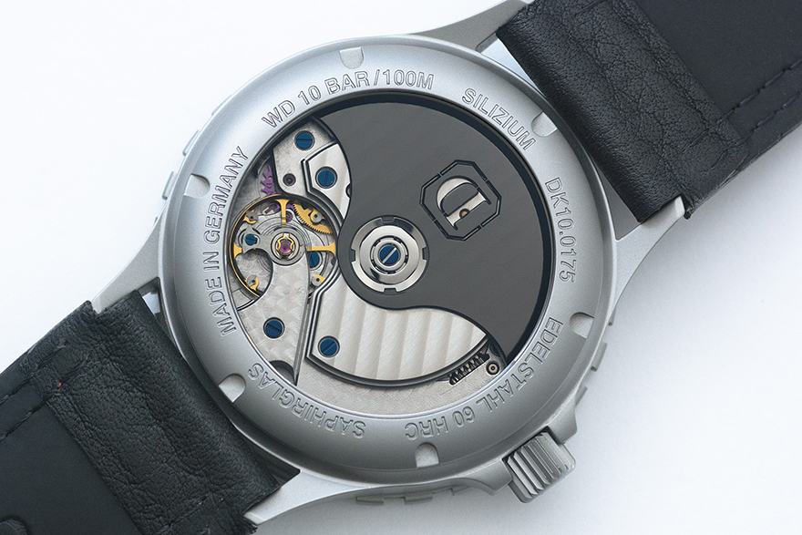 Cal.A35-1を搭載するDK10 Lは、マニュファクチュールとしての技術が最も注ぎ込まれたモデルのひとつである。トランスパレントバックから見えるムーブメントは、厚く大きな受けに覆われており、表面はストライプが施されている。