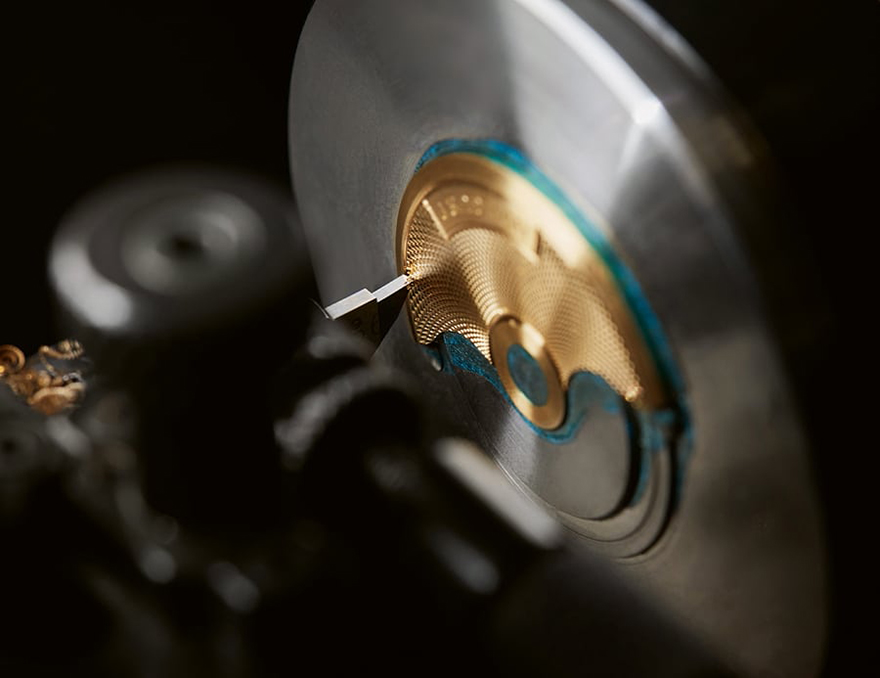 ヨッヘン・ベンツィンガーの説明によると、ギヨシェ彫り機にノミをセットするときは、彫りの深さが対象物に対し一定になるよう、強過ぎず弱過ぎず、ちょうどいい圧力をかける必要があるということだ。面からノミを付けたり放したりを繰り返すと彫り込みの深さに関わる。最初から最後まで一貫させることが望ましいかもしれないが、「手は機械ではない」とベンツィンガーは語る。「そこに見られるわずかな不均一さこそが手仕上げの文字盤の魅力なのだ。文字盤に生命の息吹と独自の輝きを与えてくれる」。