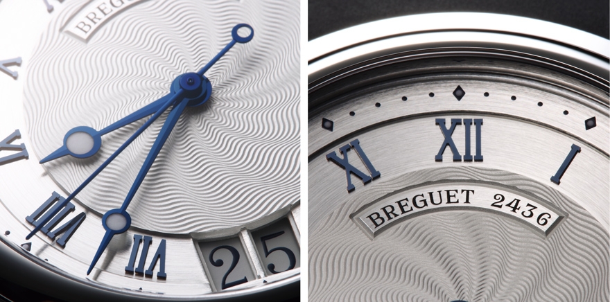 もっとも、SSモデルが加わったといっても、マリーンは決して「エントリーモデル」ではなかった。その証拠に金を彫り込んだギヨシェ文字盤や、青焼きの針はそのまま残されたうえ、ブレスレットも、相変わらず凝ったものだった。なお2005年に追加されたブレスレットは、第1世代のコンビモデルを思わせる4連(正しくは6連)のブレスレットである。しかし、14年の新しいブレスレットは、よりスポーティーさを強調した2連に改められた。ブレゲは、高級さを損なわない範囲で、このモデルを時代に合ったものに進化させたわけだ。それを象徴するのが2004年に発表された本作である。6時位置に設けられたラージデイトは、当初ブレゲらしくないと批判を受けたが、たちまちマリーンのアイコンとして認識されるようになった。