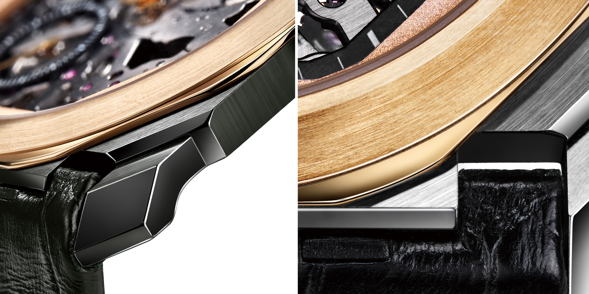 (左)搭載するCal.128SKは、後のフィニッシモムーブメントほど部品の重複を避けていないため、むしろ立体感に富む。スケルトン化した眺めは圧巻だ。