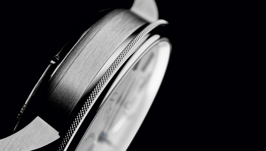 文字盤と手巻きムーブメントの部品は、非常に丁寧な研磨による銀メッキ仕上げとなっている。この入念な工程で細かい銀粉と塩、水を混ぜたものを手作業で塗り込んで繊細な輝きを出してから、ガルバニックグレーコーティングが施されている。ポリッシュ仕上げの伝統的な青焼きの針とアプライドインデックス、ベゼルサイドのローレット加工がさらに高級感を引き立てる。
