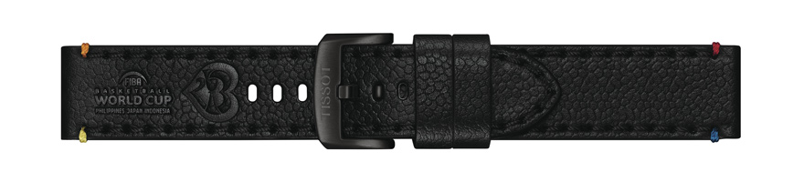 ワールドカップのメインカラーにちなみ、ストラップにはブルー、レッド、オレンジ、イエローのコーナーステッチが施されている。また大会ロゴはストラップと同じブラックでエンボス加工されており、このモデルのエレガントさをより一層引き立てる。この特別仕様のストラップは、ティソのインターチェンジャブルブレスレットにより、ラグ幅22mmのどんなタイムピースにもぴったりとフィットする。