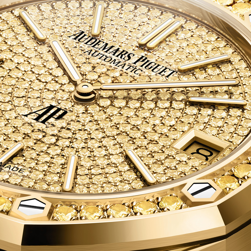2 種類のゴールドダイアルは、光の加減で微妙な色のニュアンスに変化する。422 個のストーンがゴールドのベゼル、アプライドアワーマーカー、そして針が光り輝くコントラストを描く。光の戯れが時針と分針の視認性を高め、サファイアクリスタルには「オーデマ ピゲ」のシグネチャーとAPモノグラムがさりげなく記されている。
